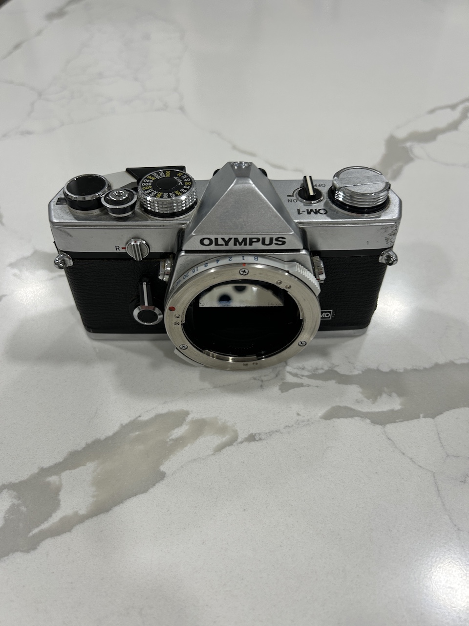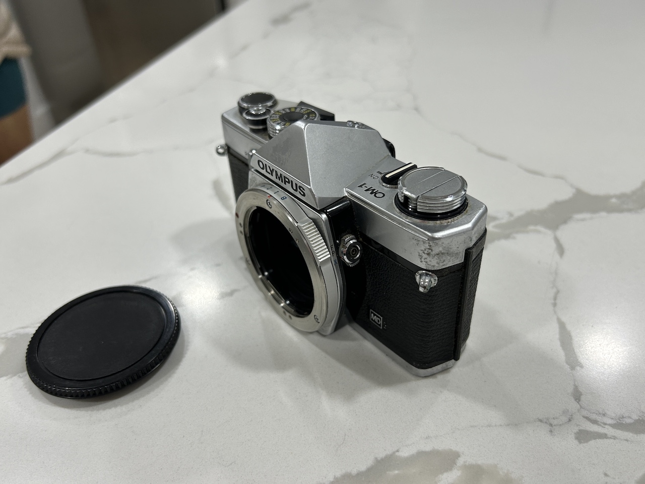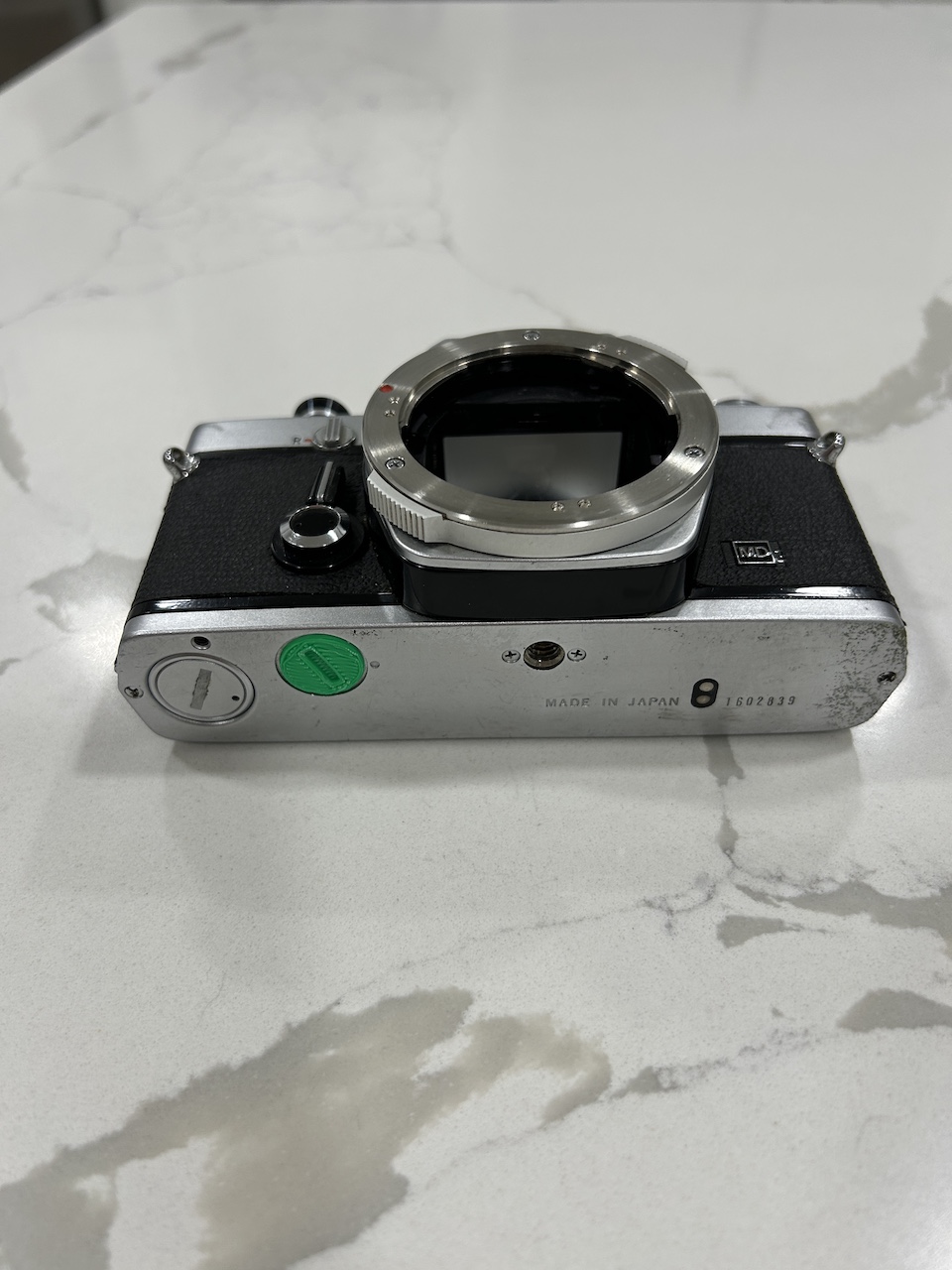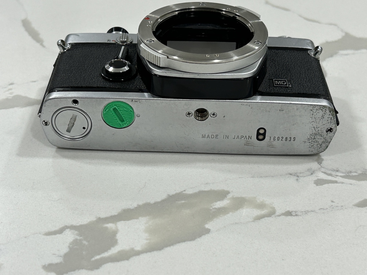 I am selling an Olympus OM-1 MD body. All functions work (shutter speeds, self timer, etc.). I tested the TTL light meter with a 1.45 V battery and the readings are approximately correct. The camera requires the MRB625 battery (1.3 V) for accurate readings however (these are widely available, but I do not have one handy at the moment). The light seals could use updating as with most older SLR's. There are no signs of damage, but cosmetically there are signs of use. I 3-D printed a replacement motor drive coupler cover -- sorry about the green color, but it works fine.
