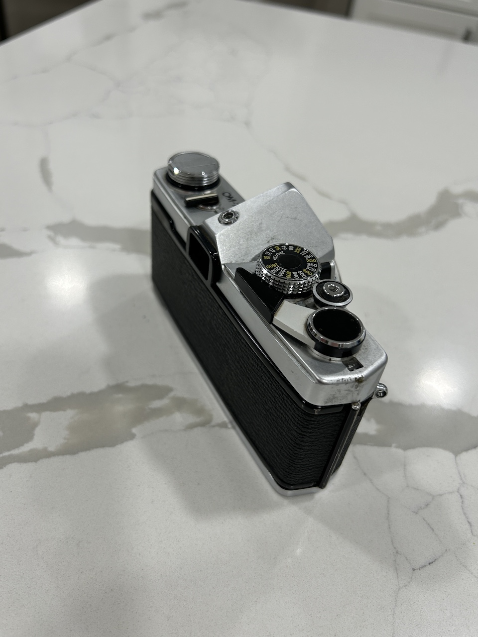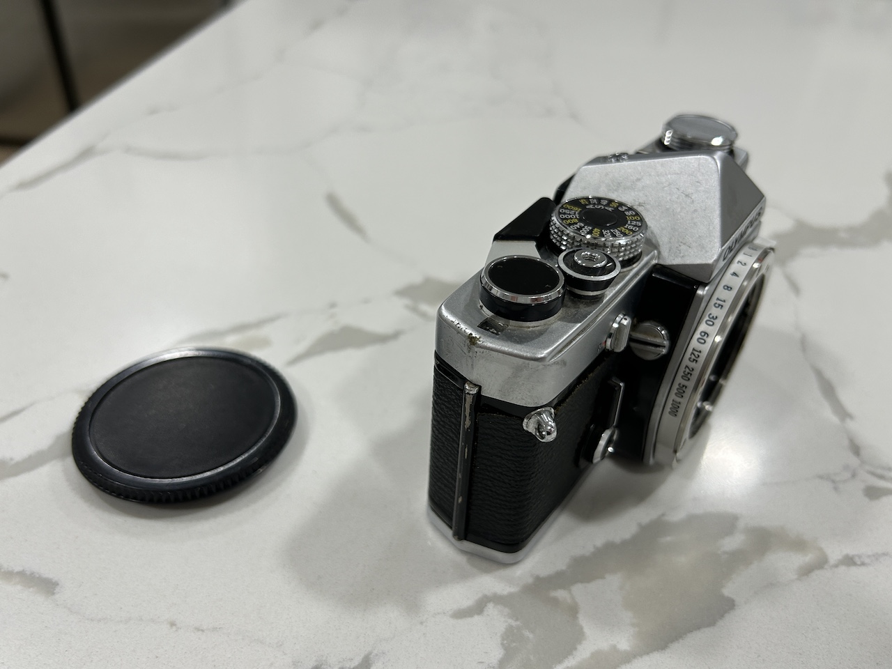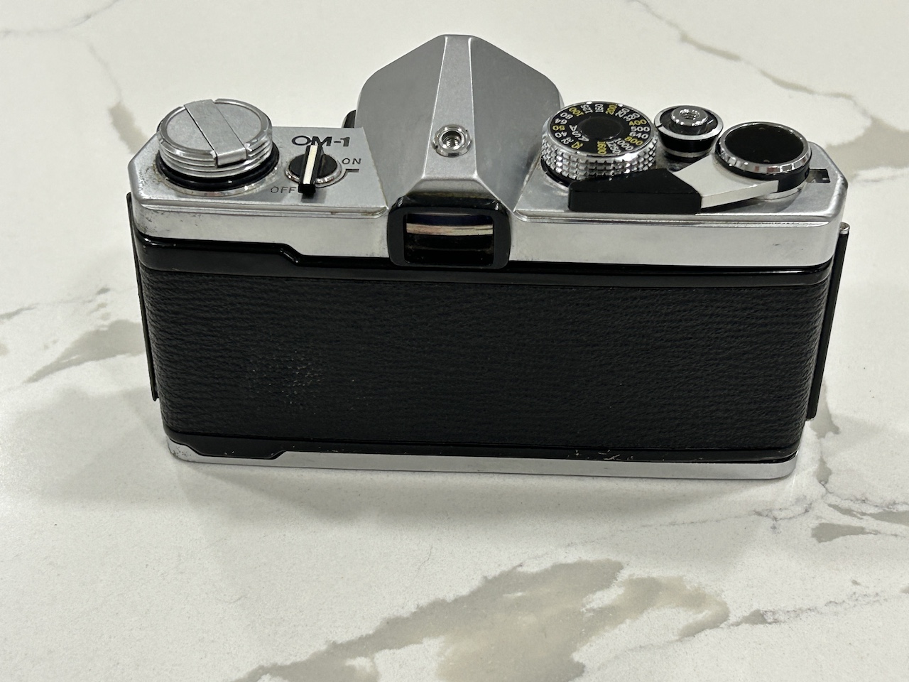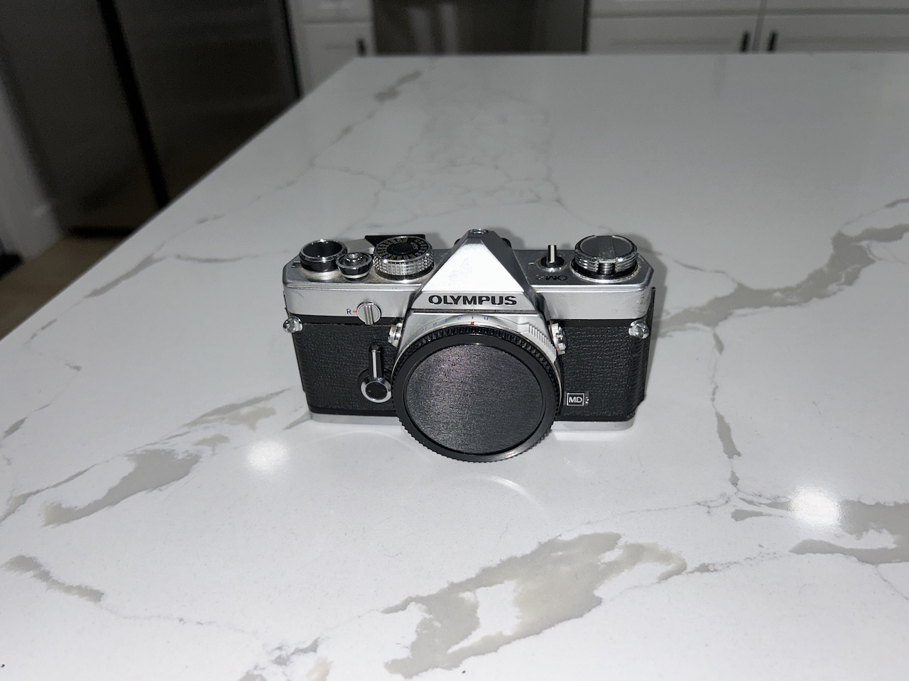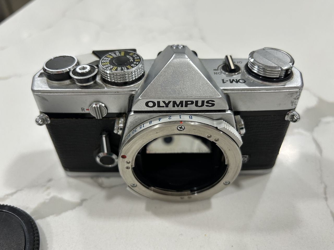 I am selling an Olympus OM-1 MD body. All functions work (shutter speeds, self timer, etc.). I tested the TTL light meter with a 1.45 V battery and the readings are approximately correct. The camera requires the MRB625 battery (1.3 V) for accurate readings however (these are widely available, but I do not have one handy at the moment). The light seals could use updating as with most older SLR's. There are no signs of damage, but cosmetically there are signs of use. I 3-D printed a replacement motor drive coupler cover -- sorry about the green color, but it works fine.