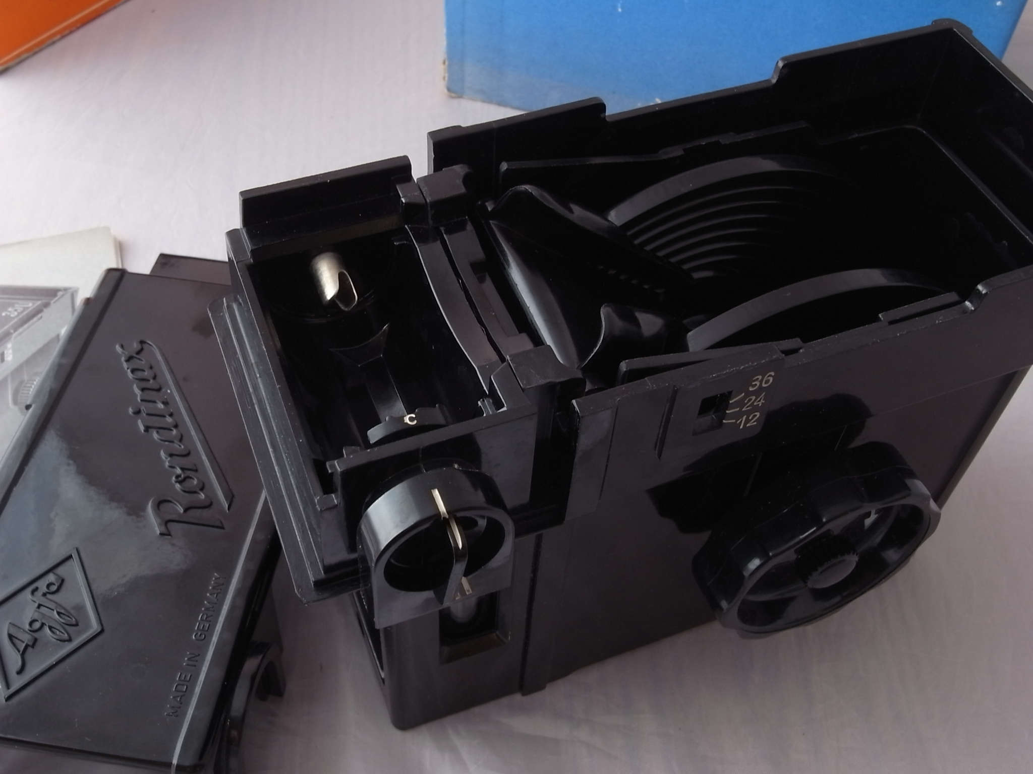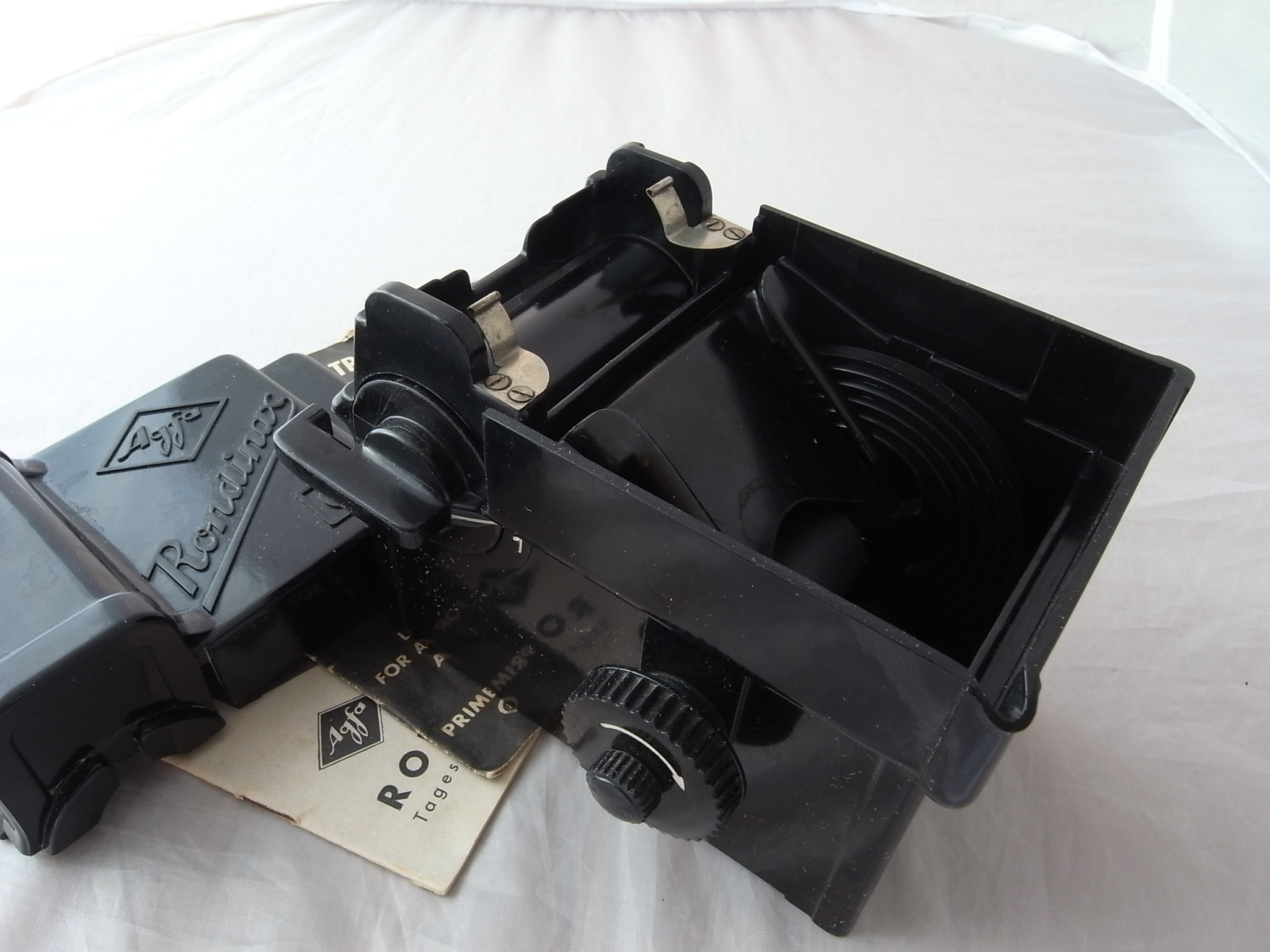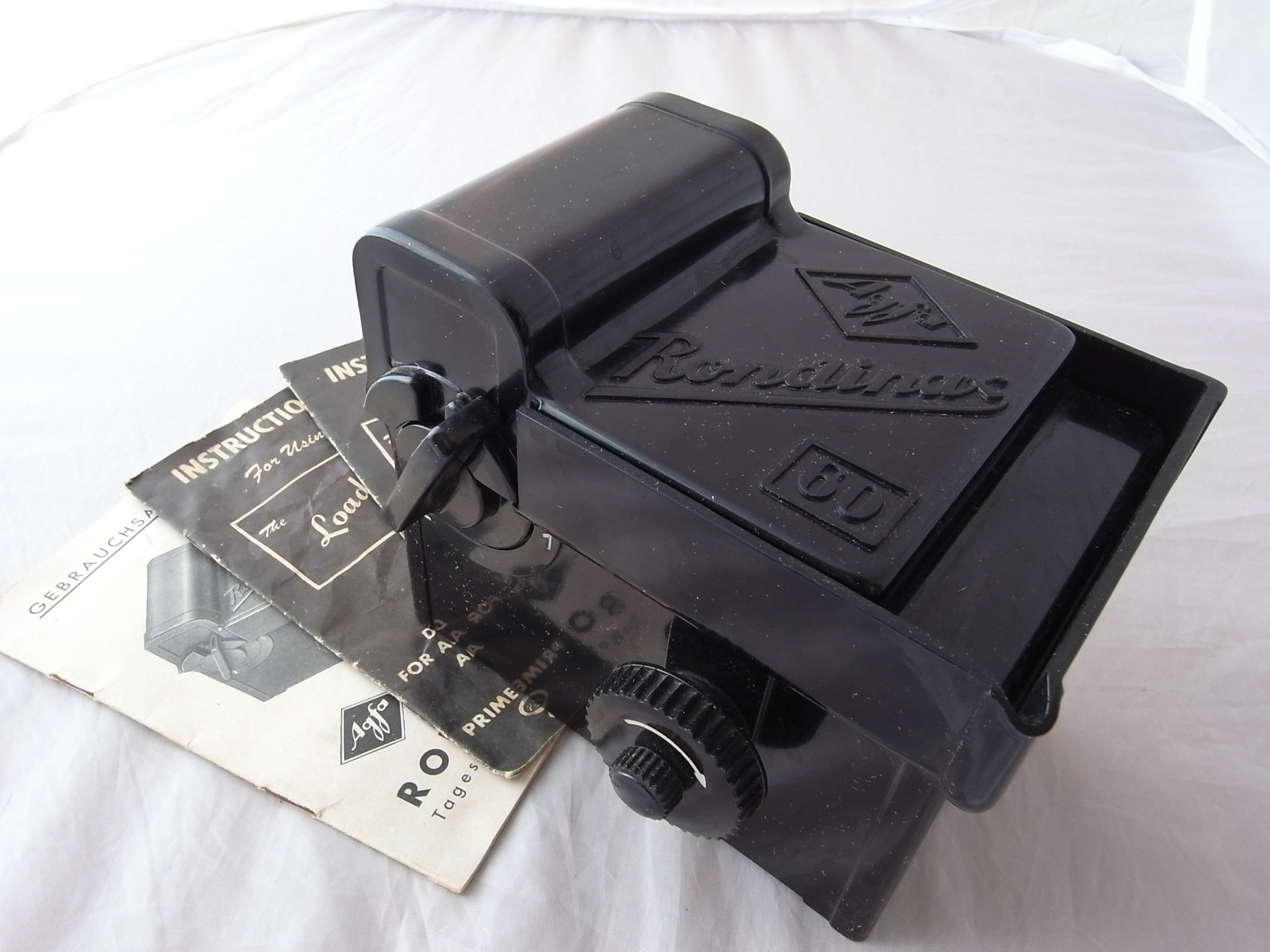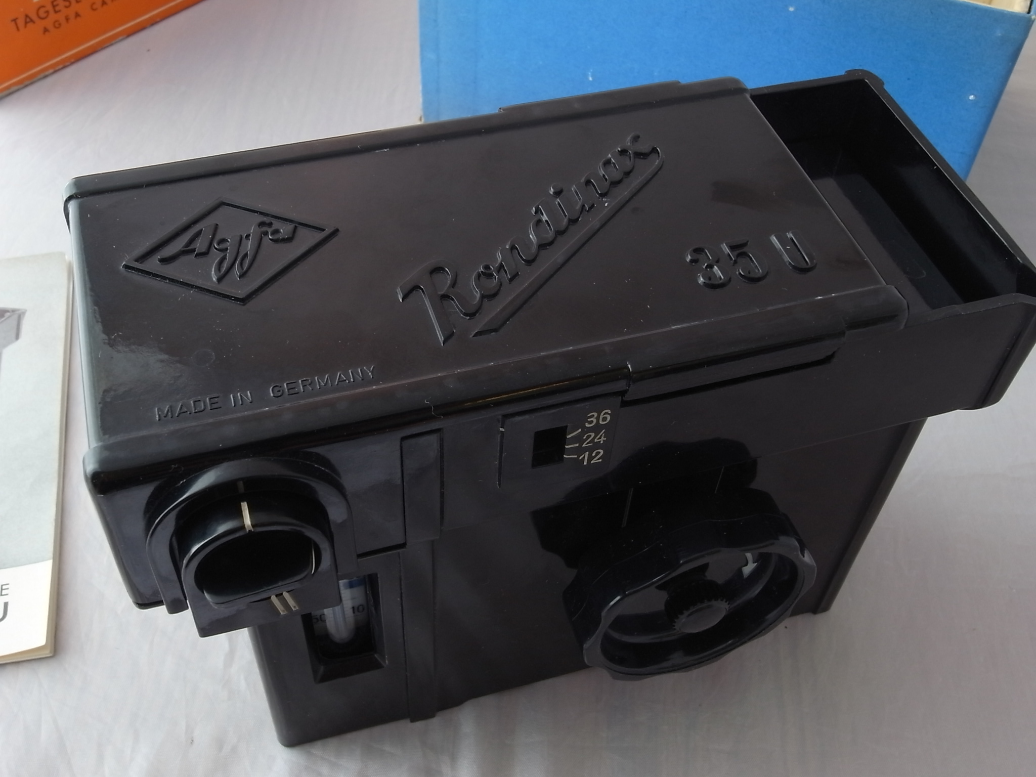 3. Rodinax 35U. This one is for 35mm film and takes standard cartridges and also takes all the popular cassettes that work with Contax, Nikon, Leica, etc. It's all in the included instruction book. The cartridge goes into the machine (in daylight), and then everything is done in total daylight, including the knifing of the film from the end of it to separate from the cartridge. Same great condition as the Rodinax 60, no dryness, no cracks, in great shape. The box is in pretty good shape too. $90 shipped F&F
