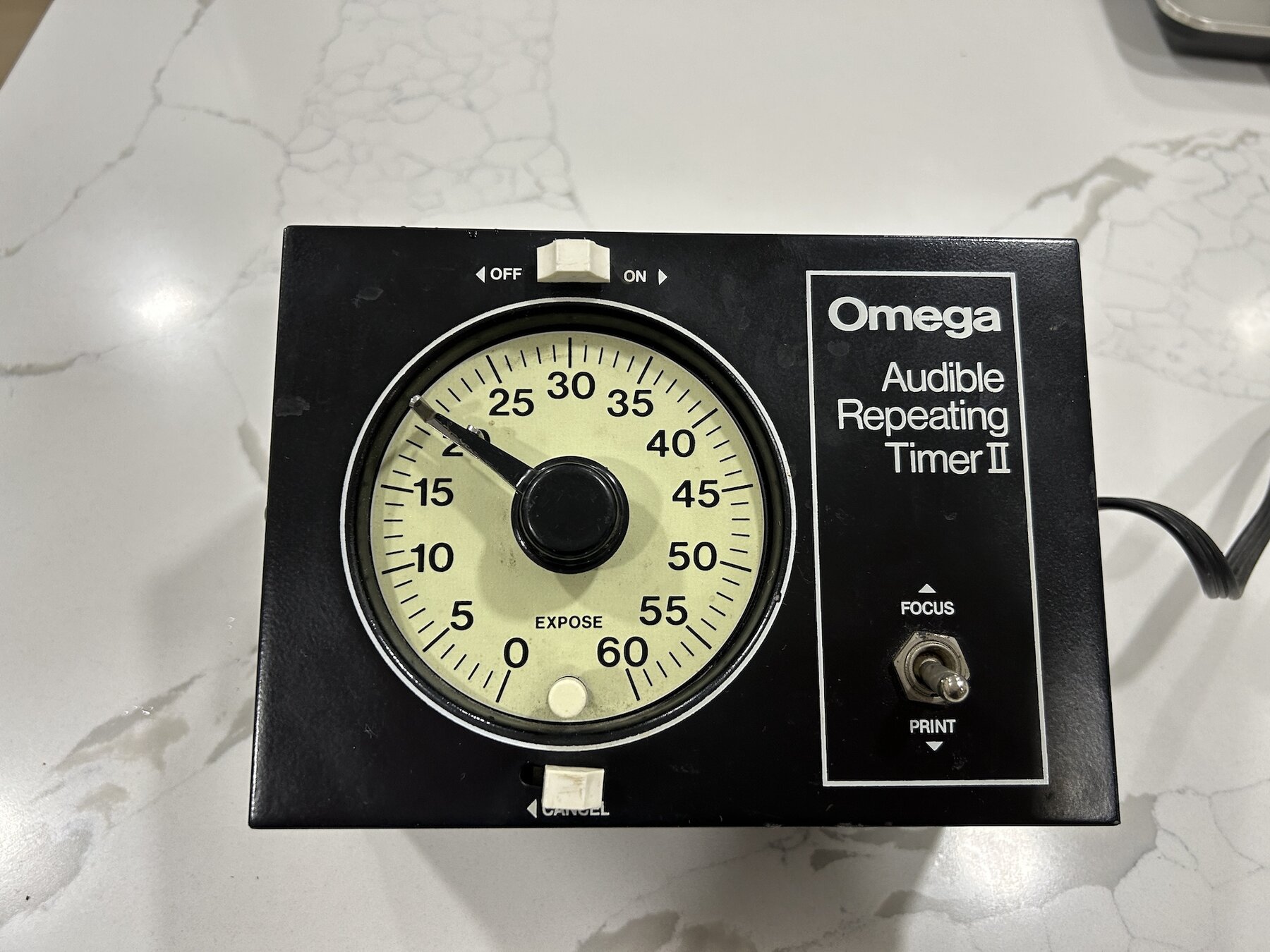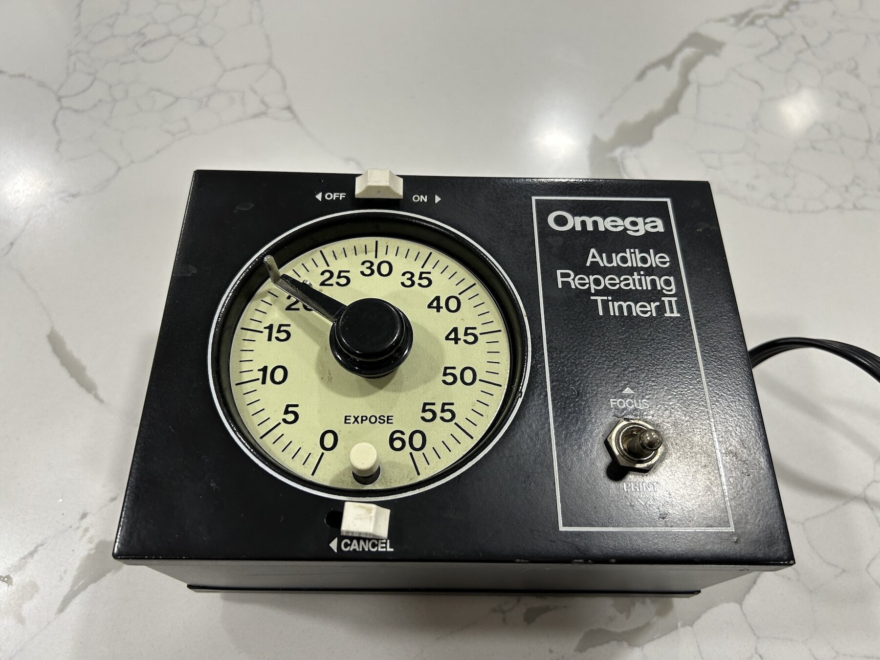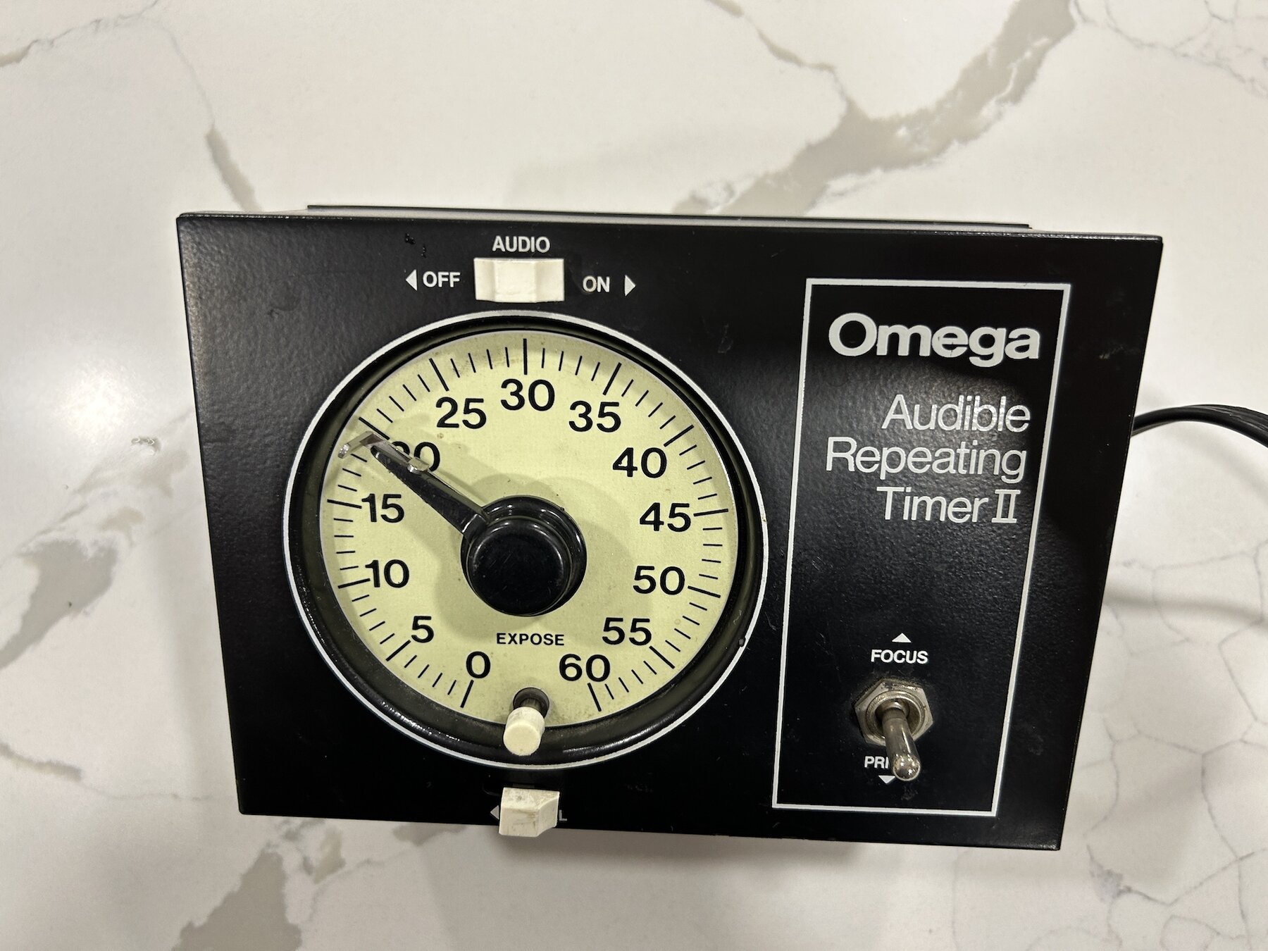I am selling a Omega Audible Repeating Timer II darkroom timer. The timer works fine, although I can't seem to get the little switch that optionally allows one to mute the usual ticking sound it makes as it counts down to stay in the off position if set there. This is a minor flaw and not particularly relevant to its normal use. This timer is a very well-made, high quality item!