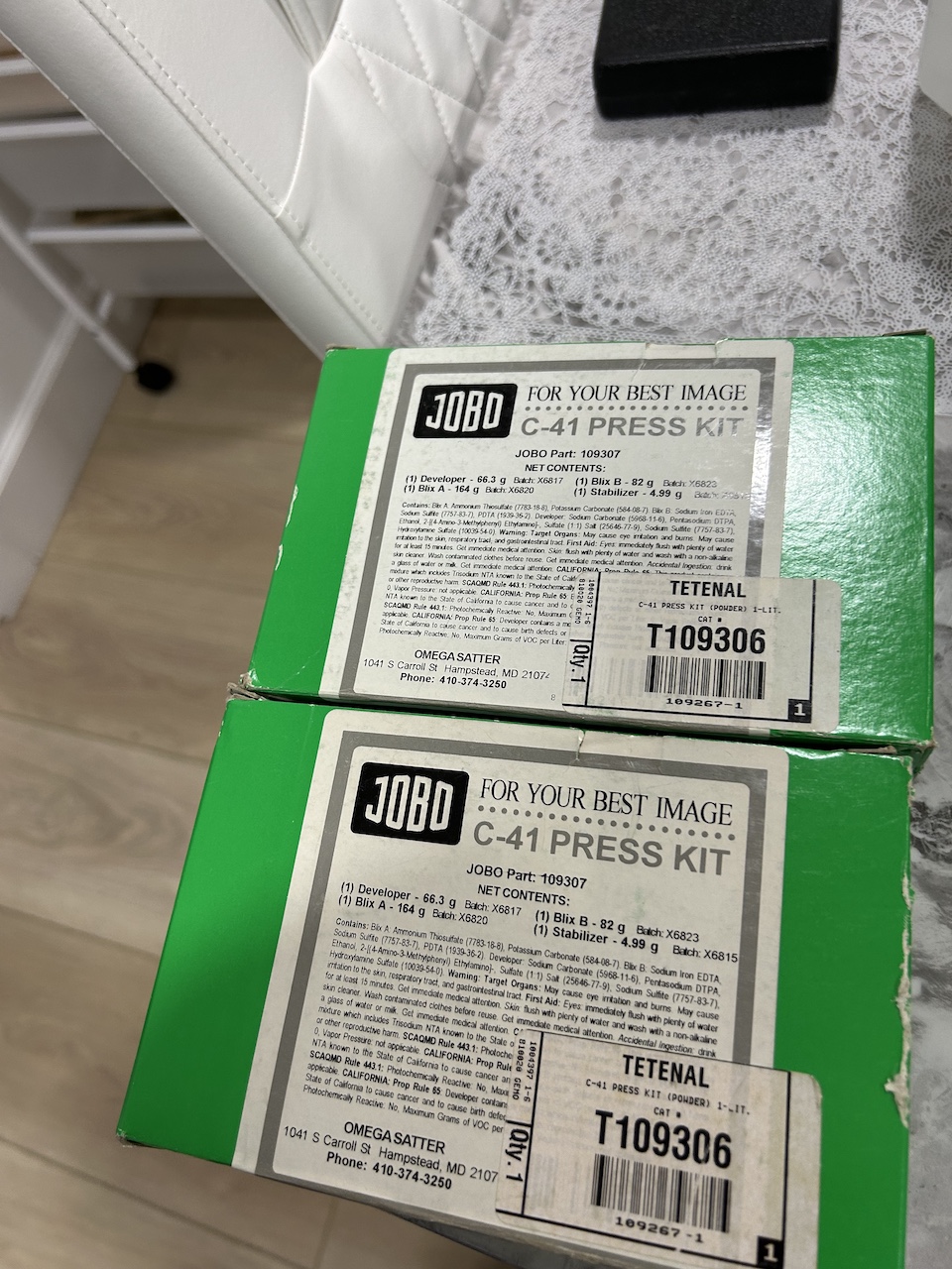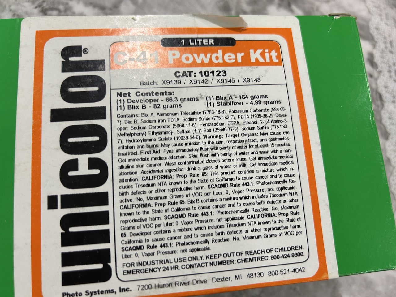 I am selling three one-liter sized C41 development kits. These are chemicals in powder form. Two of the kits are by Jobo, the other by Unicolor. Instructions are included. I have used these in the past with excellent results, in fact developing far more rolls than they are officially rated for.