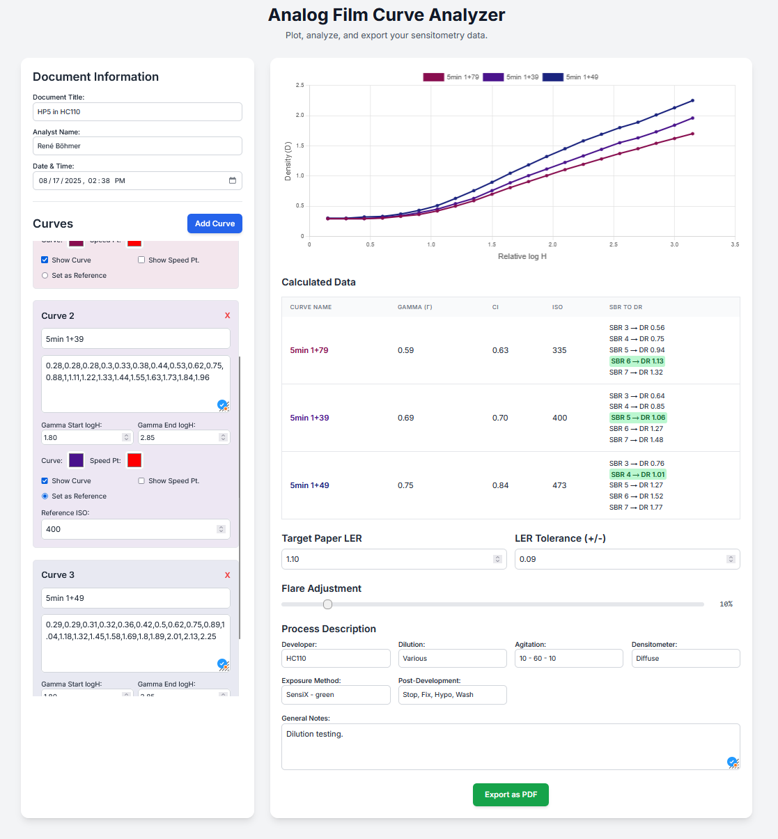 Yesterday, while working on my tonal reproduction tool, I had the idea to make an online plotter for anyone who wants to plot their curves quick and easy. With this free, online tool, you can just input the 21-Step tablet Density measurements you made. The Tool will assume 0,15 log H steps. It is meant to be used with relative testing, this means you don't know the (luxs) exposure intensity that was used to expose the different densities. You can assign one curve (the one you developed for box speed) to your reference and enter the speed. Based on this, my tool will calculate the relative speed for each curve. It also shows the contrast index or gamma of the curve. (Contrast index is similar to gamma but takes another way to calculate curve form). You can also enter ISO R or LER in a field with some tolerances, and my tool will show you what curve to use for which paper. I also included a Flare slider, which will add a haze over the data that is more active in the shadows. (This is done because Camera systems and Optics don't transfer scene illuminances without distorting them.) You can export all your data in a somewhat nice PDF. I am still working actively on my tools, so take everything with a grain of salt.