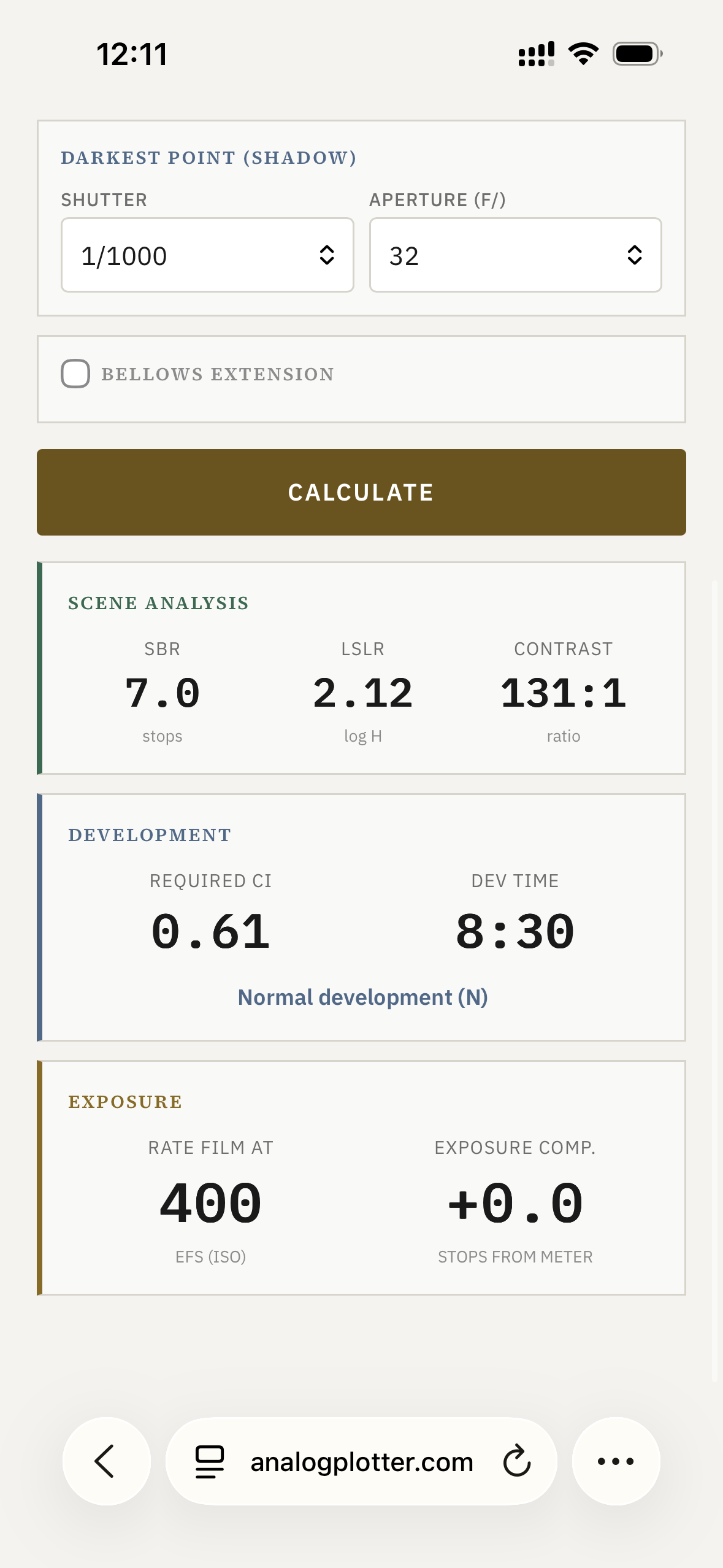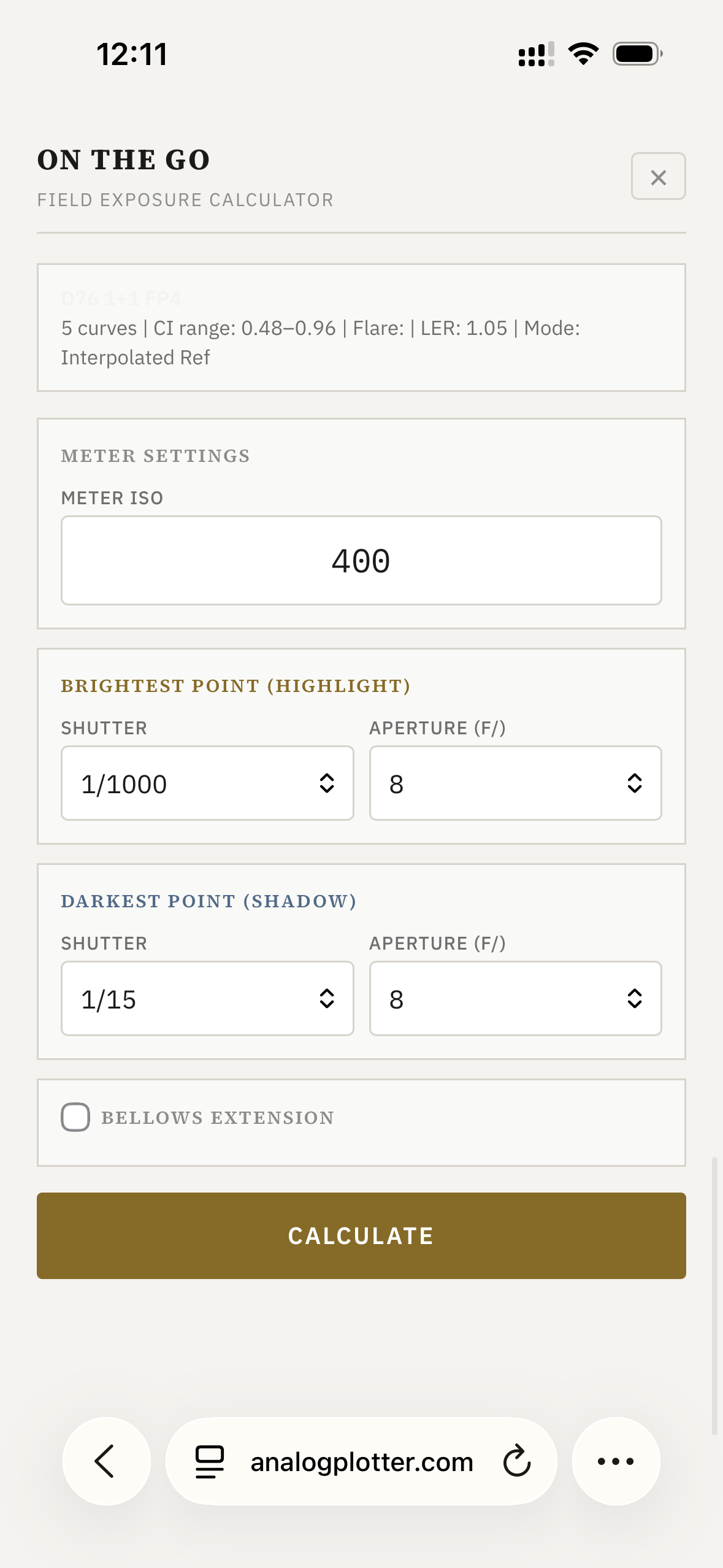 The tool now has a button called "on the go" you can enter this mode after importing a curve set, on your phone. You can enter your meter's ISO and then measure the brightest and darkest scene element. Enter these two into the tool, and it will tell you (based on your data) how to expose and develop. For LF users, there is also a bellows extension feature factored in.