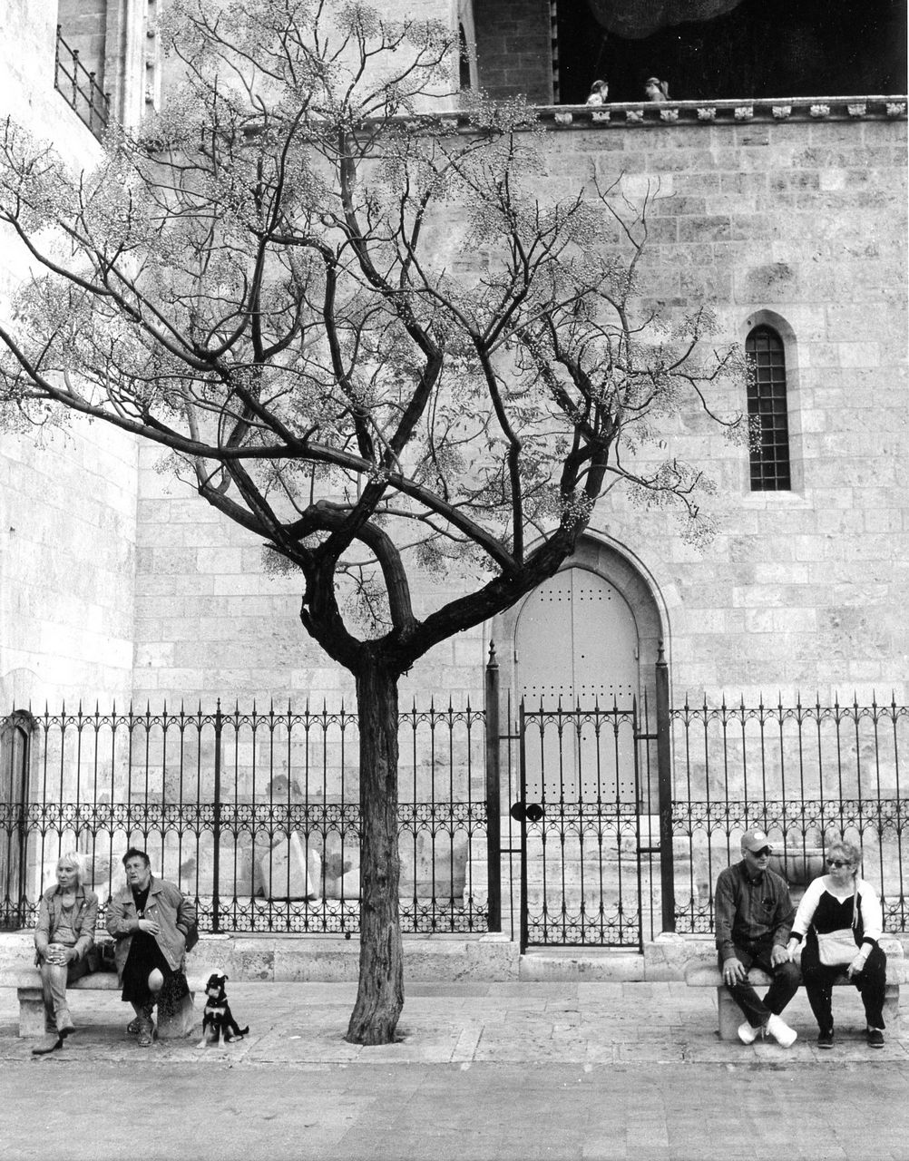 Love this. Establishes a clear relationship between the (older) couple on the bottom left with the (younger) couple on the top right, and the fenced arched doorway on the bottom right with the fenced arched window on the top left, all this forming an "X" (Cartier-Bresson would have like that). The tree in the near middle bring equilibrium to the whole, paradoxically through the chaotic design of its branches—the "natural" chaos of nature in the middle of the "unnatural" X. Furthermore, since you have an old couple in the bottom and a young one on top, the tree symbolizes the passage of time — the "older" trunk in the bottom moving to the "younger" branches on top mirroring the ages of the two couples— and also becomes metaphorically a genealogical tree.