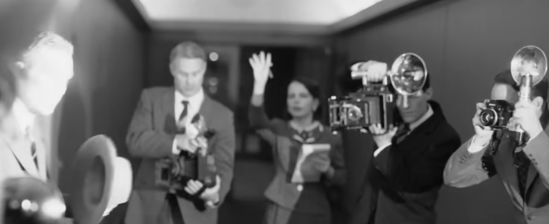 Oppenheimer's AEC security clearance hearing was in 1954 - there shouldn't be a Nikon SLR of any kind in there at all (or any 35mm SLR really, a few existed but not that would have been used by a US press photographer). The production photographer would never get in the camera frame like that with period costume but anachronistic camera, surely. Ordinarily I don't pick on small chronology errors (lots of "movie set in 1960 has a 1962 car" or whatever), but this one is a howler.