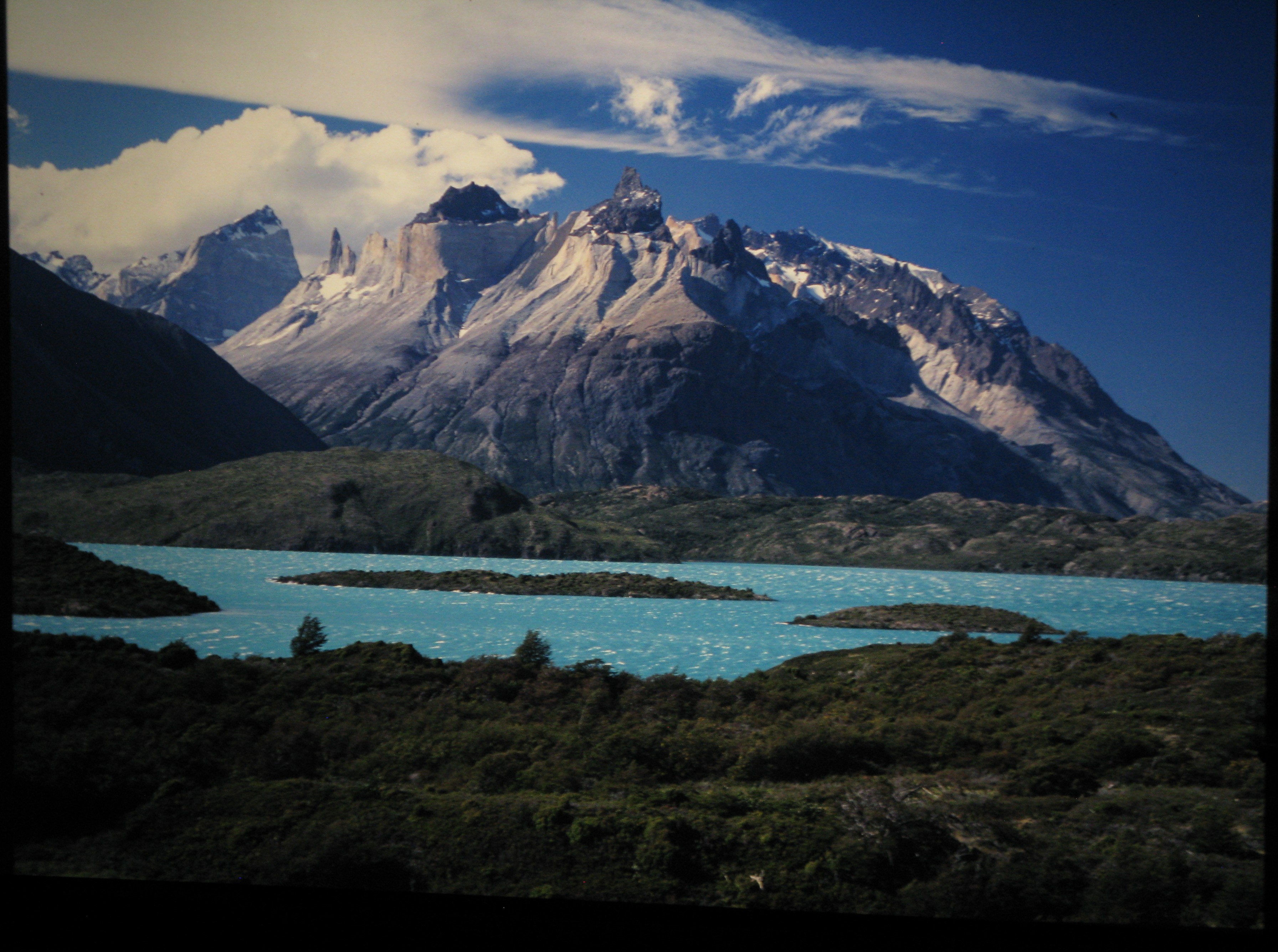 Most of my shots are taken in landscape orientation but a few of them are portrait compositions and those won't fit onto the screen without moving the projector further in. I could save those for last or change the FL of the lens to, say 200mm. Multiplying 200mm by the reciprocal of the aspect ratio seems to fit. Cabin did make a 200mm lens for the 67Z but I haven't found any for sale. Below is a snap of the screen as set-up over the weekend with a cardboard mounted slide. The image was taken on a hiking trip to Torre del Paine NP in Chile.