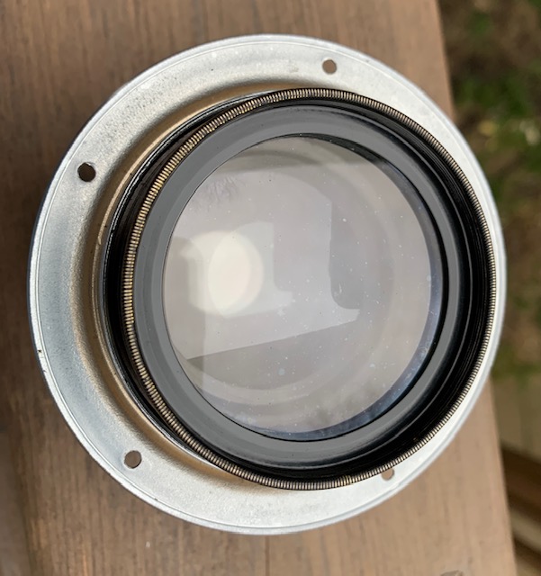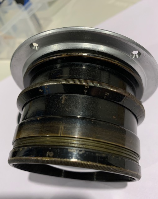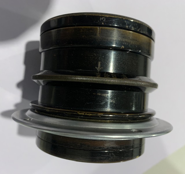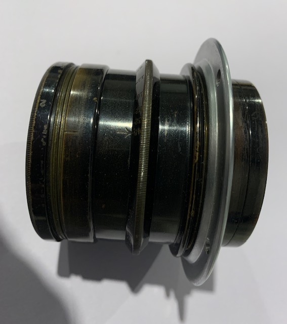 Selling a Velostigmat f4.5 9 1/2 inch Series II soft focus lens in barrel. Lens has been uncorked to allow maximum soft focus and soft focus adjustment is smooth. Glass is in good condition with a few cleaning wisps and the usual dust specks. Lens barrel shows brassing and marks through use over the past years. Aperture opens and closes smoothly and blades are oil free. Comes with mounting flange. I am told the lens cells screw directly into a Betax or Alphax 4 shutter but I do not have a shutter to check. Covers 5x7 and some literature says it will cover 8x10.