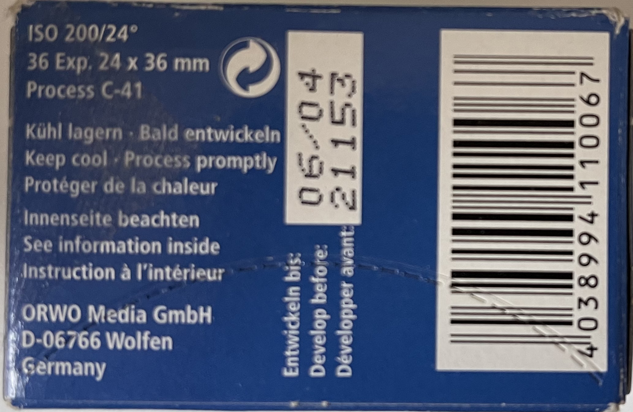 Just a picture of an unopened box of the CNS 200 (hence Konica). I’m adding a BW film (Orwopan 25) to compare the writings on the boxes (change from Filmfabrik Wolfen to OrwoMedia, new German 5-digit zip code - meaning the Orwopan box was made before 7/1993 and the CNS afterwards; the Orwopan best before date was 11/97.)