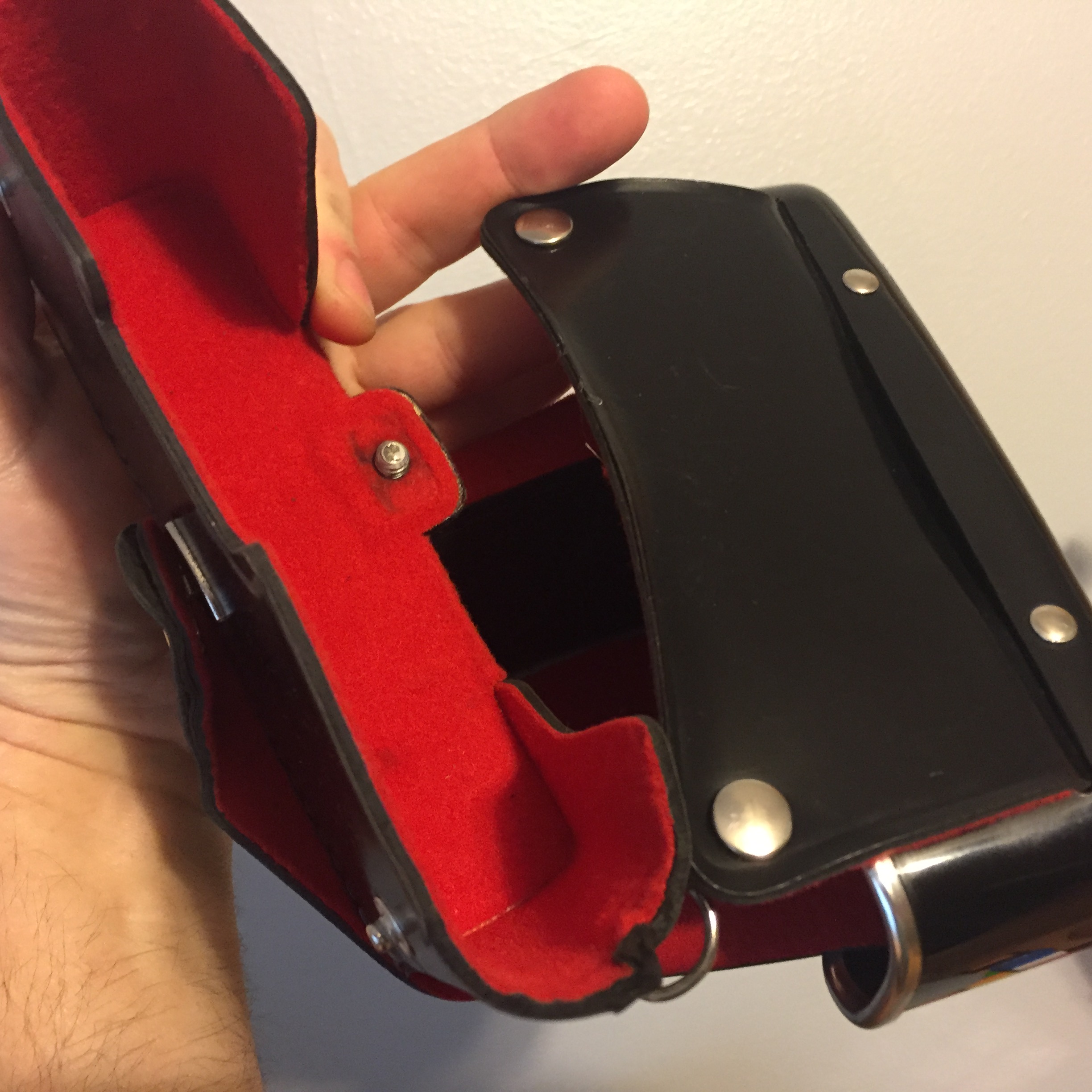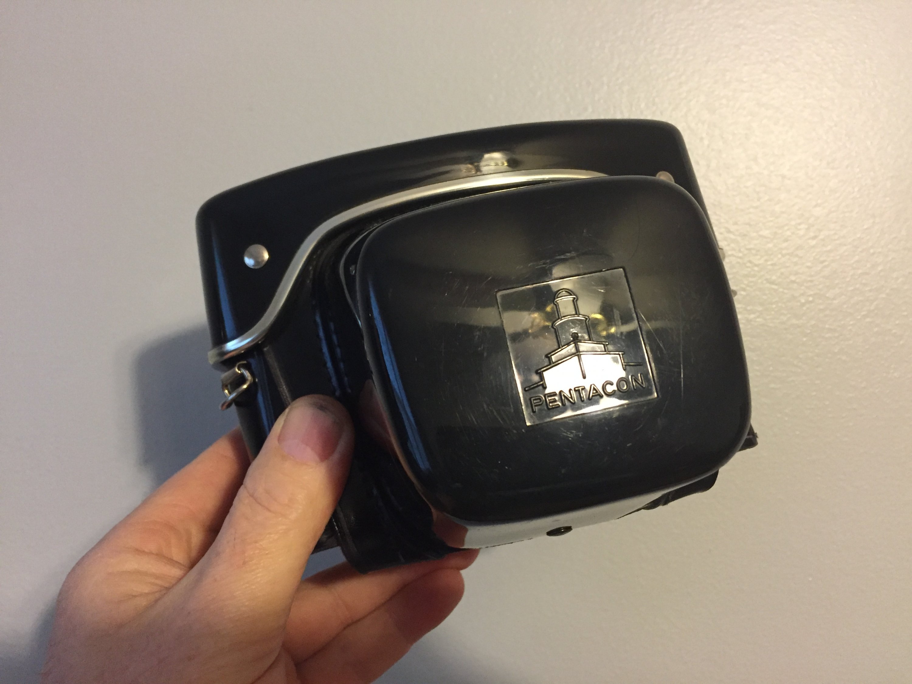 Pentacon Everyready Case: Patent leather like material with red lining. Might be for a Praktica MTL 3 type SLR?