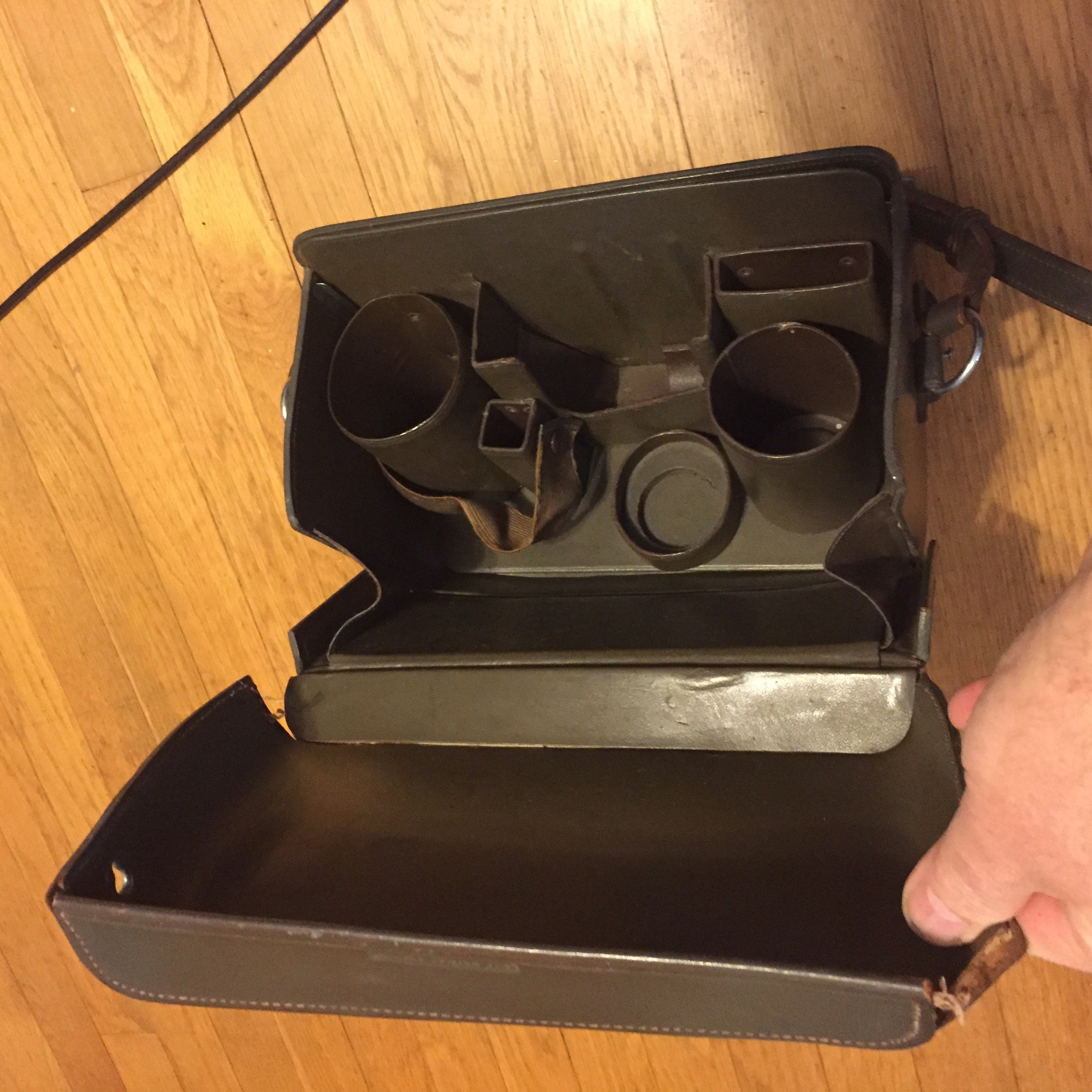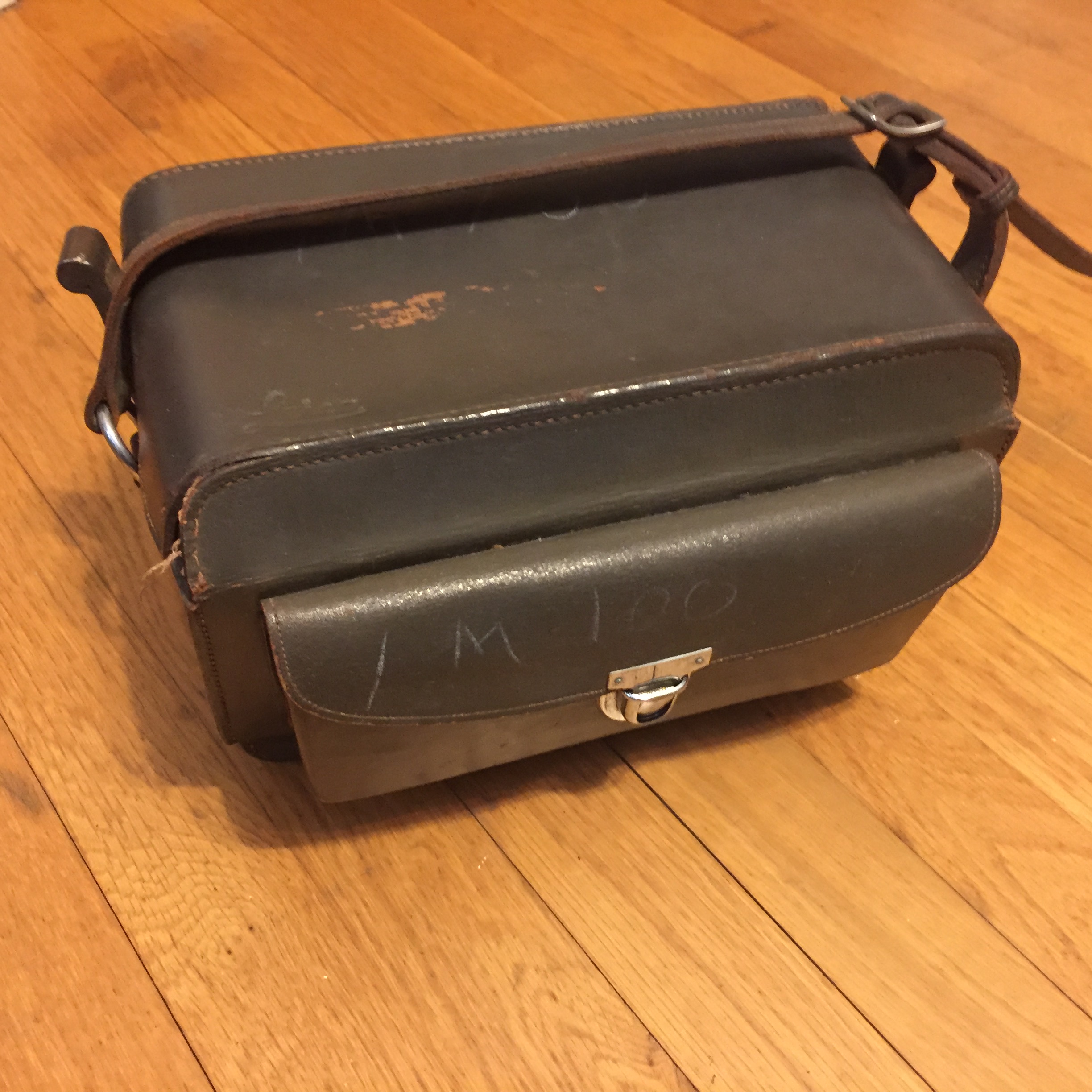 Leica Systems Case: Olive Green Leather. Stiff with stitching loose on top cover around back corners, but not terrible. Needs cleaning and treatment due to age, but looks complete. Grease pencil marks on exterior.