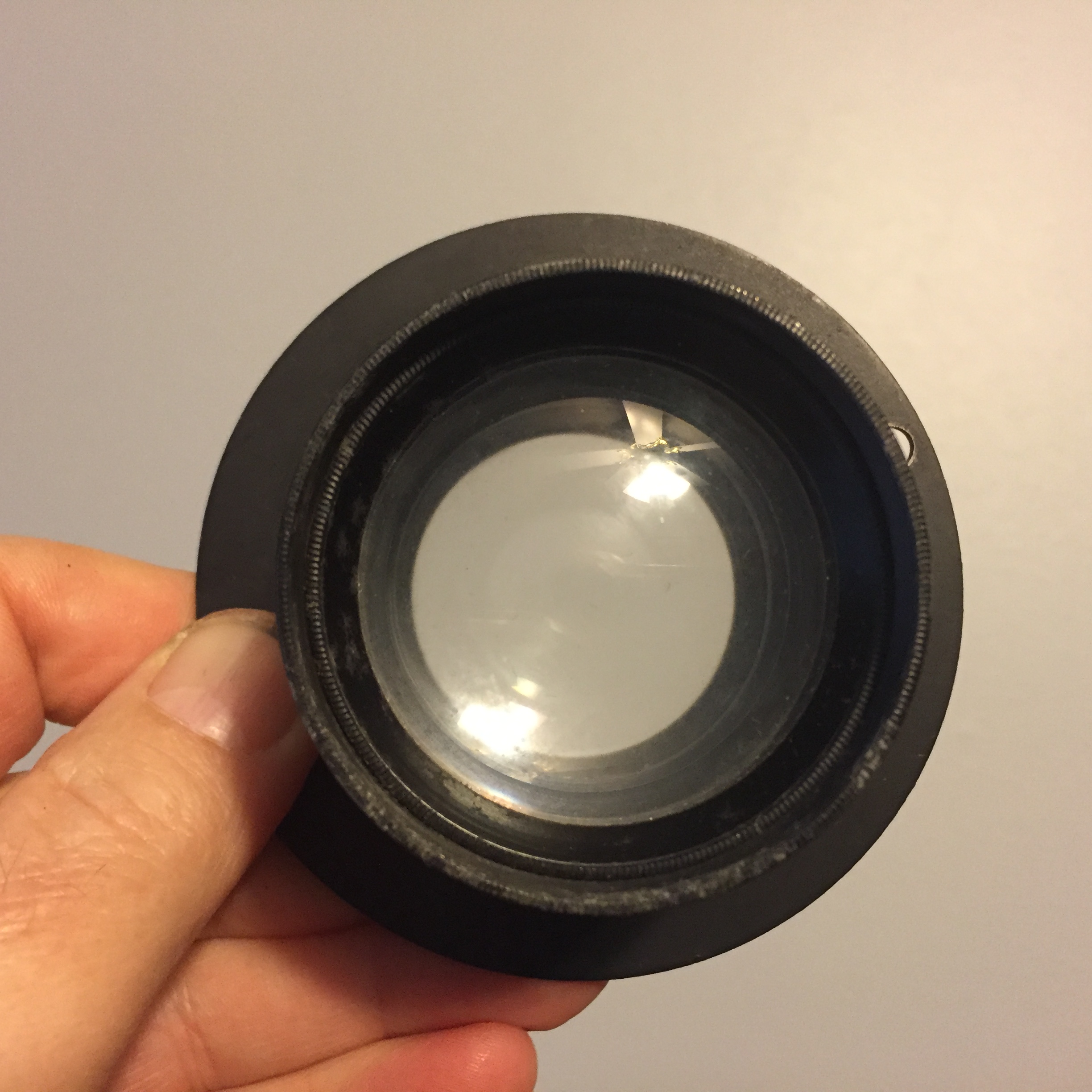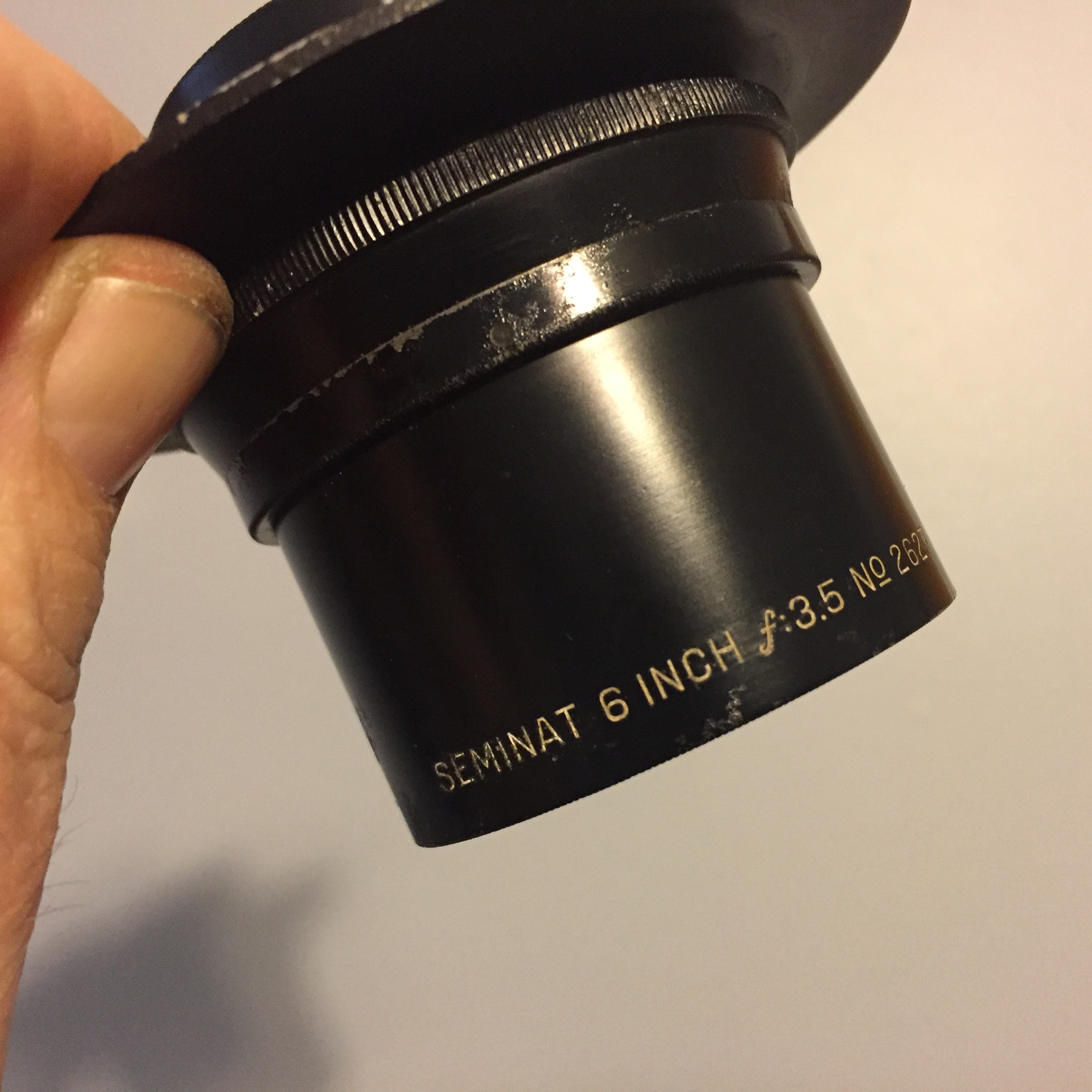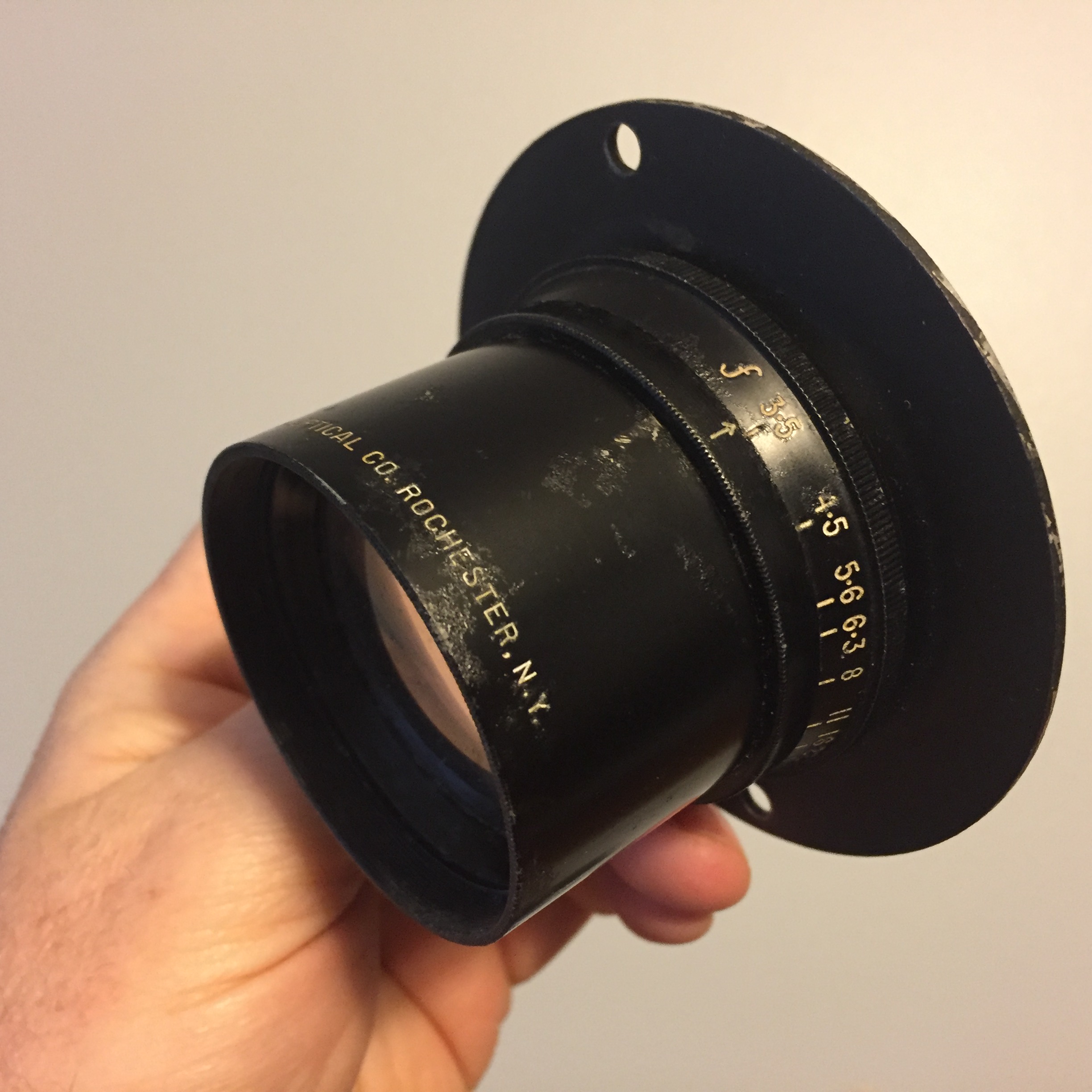 Semiant 6 Inch F3.5 Ilex Optical Company lens with flange mount. Front element hazy, rear element has fungus creeping in from edges, but I think as an uncoated lens, it could be cleaned and used. Many segmented aperture works. Might be the thing for wet plate or a speed graphic experiments!