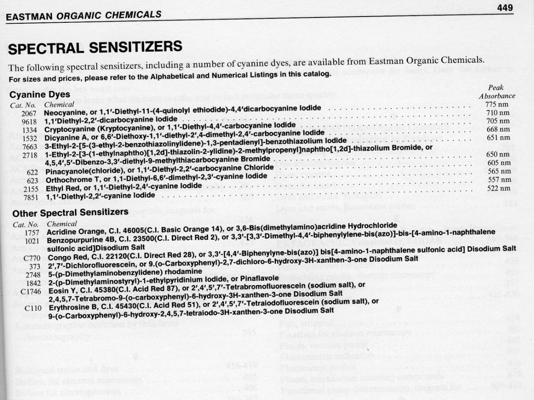 However, doing R&D on sensitizing dyes is a very expensive and time consuming undertaking. Do as much as you wish, but the ones that I suggested here to Bill work very well for Br/I emulsions. In addition, Erythrosine works well if you use the methods I spell out. Data for that is in Mees and James as well.