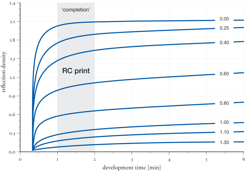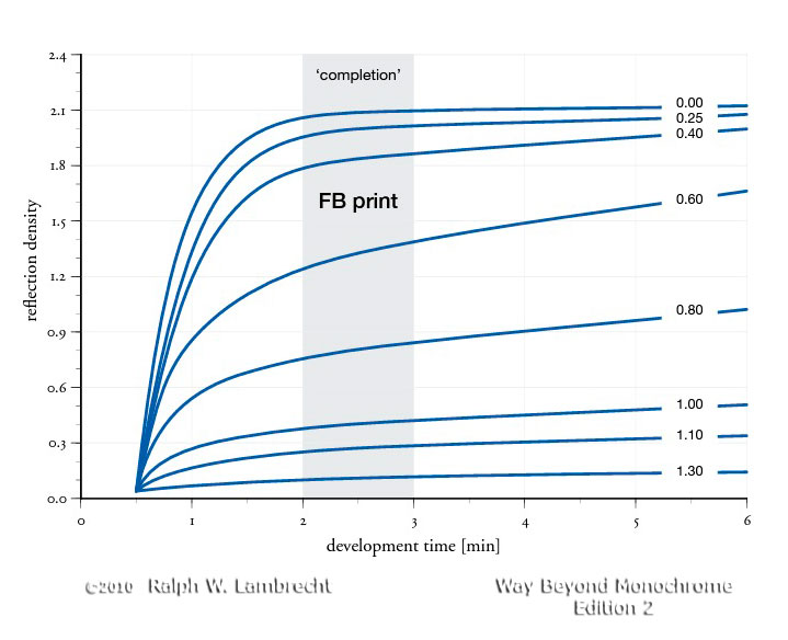 'development to completion' is a bit of a myth. As you can see from the attachments, print density increases with development time for all tones except Dmax. For consistency, it is best to terminate the development after a material dependant fixed time (RC) or to control it through factorial development (FB).