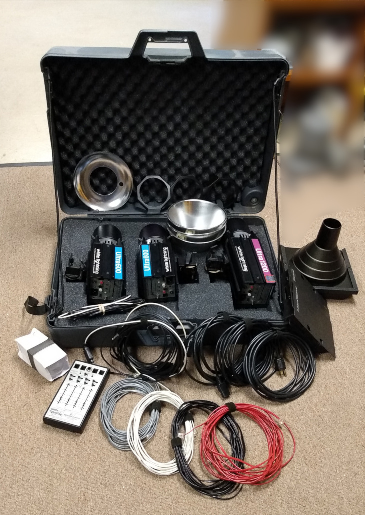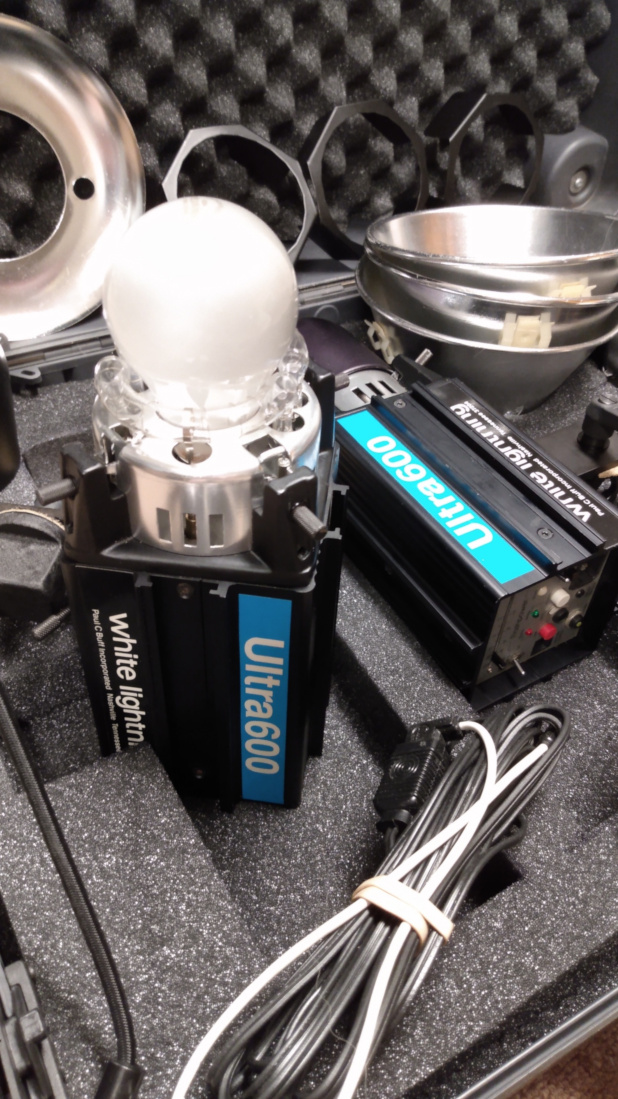 This is a set of 3 Buff White Lightning Ultra monobloc strobes and accessories from my pro days. I have been hanging on to them, but it’s time they make someone else as happy as they did me. I used them for LF work in studio for portraiture and table-top work, as well as on location for both portraiture and architectural interiors. They pack a wallop, and the built-in slaves are very sensitive, which was great on location. I was a one-man band, the only one who handled them. I’m careful. All equipment is in very good condition. KBX Photographix services them.