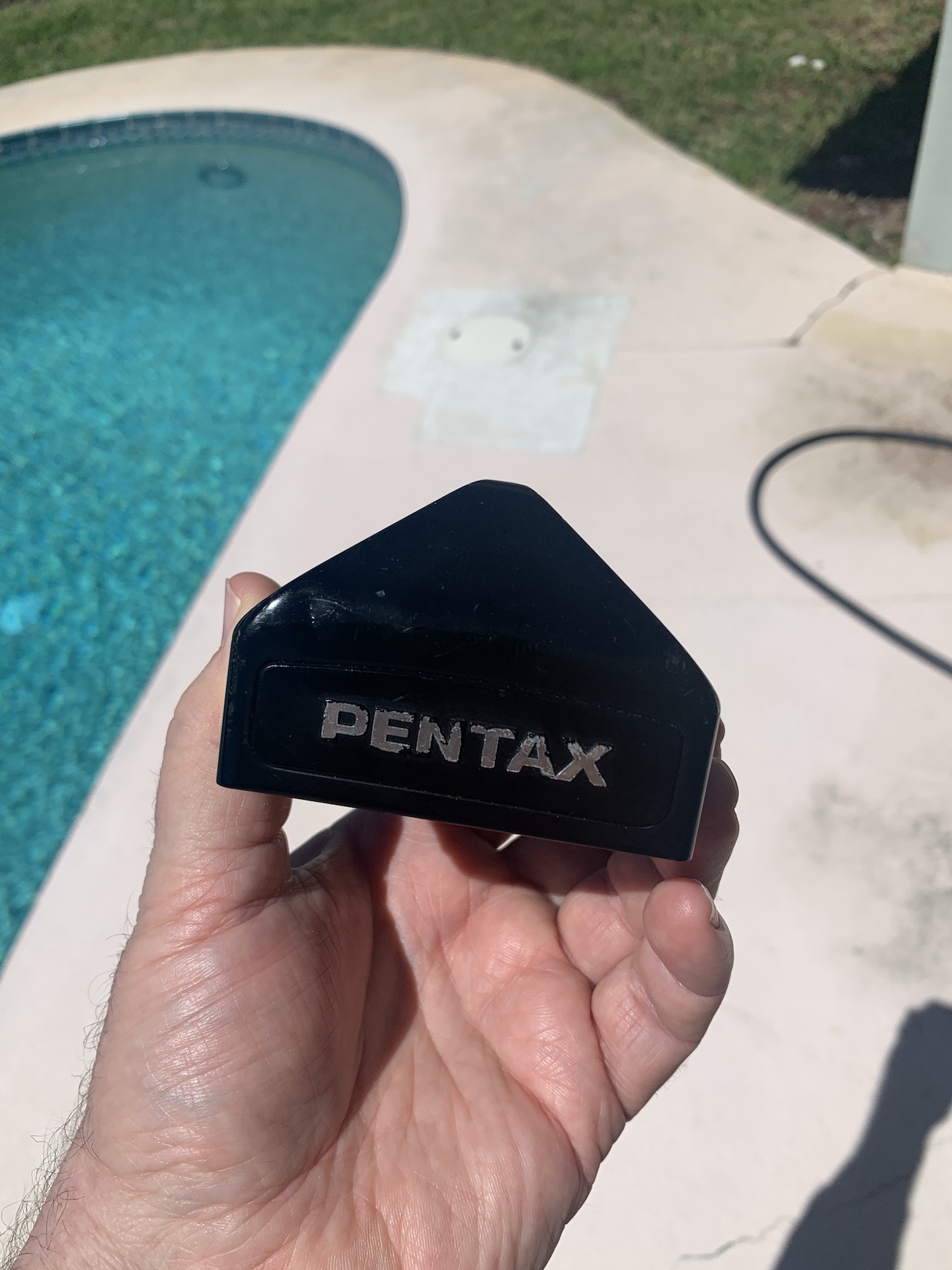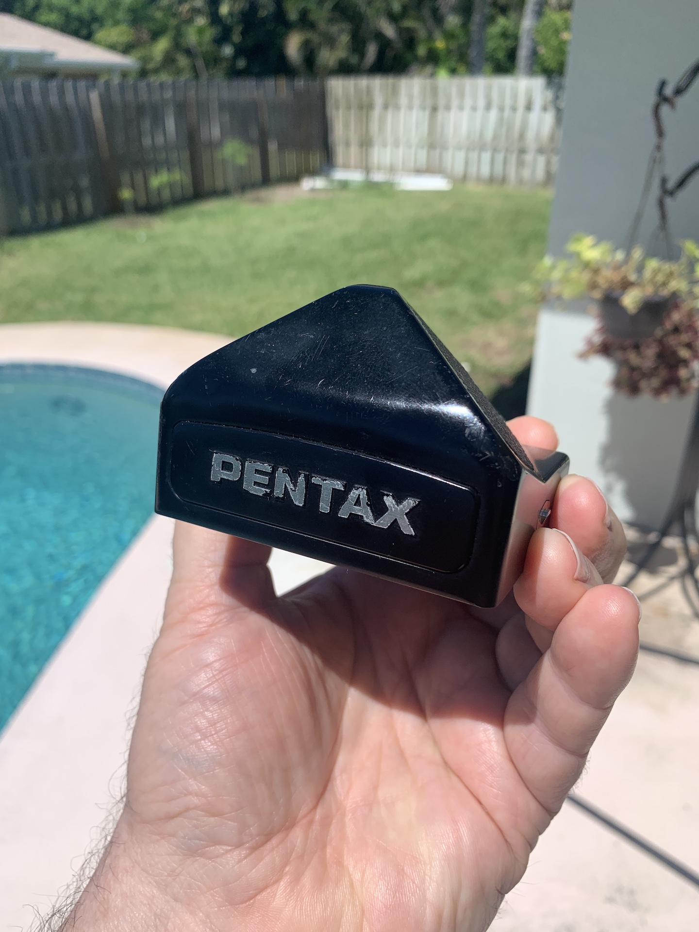 Pentax 67 eye level prism. The optics are very clean, clear, and dust free. The cosmetic condition is good. There is a tiny dimple on the front surface just to the upper left of the "P" in "Pentax" and a tiny bit of brassing here and there on corners. This is a very nice item.