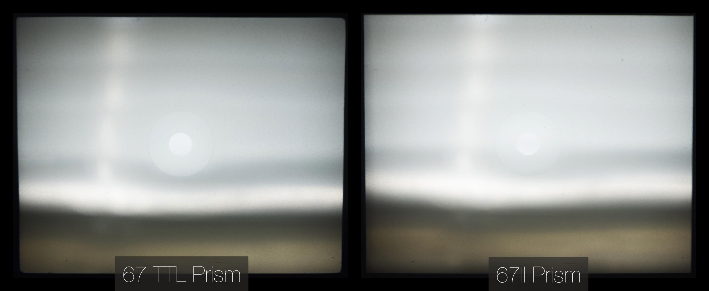 I recently acquired a Pentax 67 that came with the 67 TTL Prism. I'd rather meter handheld with all my film, so I never loved the extra "bar" for the shutter coupling, plus I found it to be rather dim and hard to view with glasses (that got scratched from the metal eyepiece. Instead of spending the cash to upgrade to a P67II or buying a Maxwell focus screen, I thought I'd try a P67II prism on my P67.
