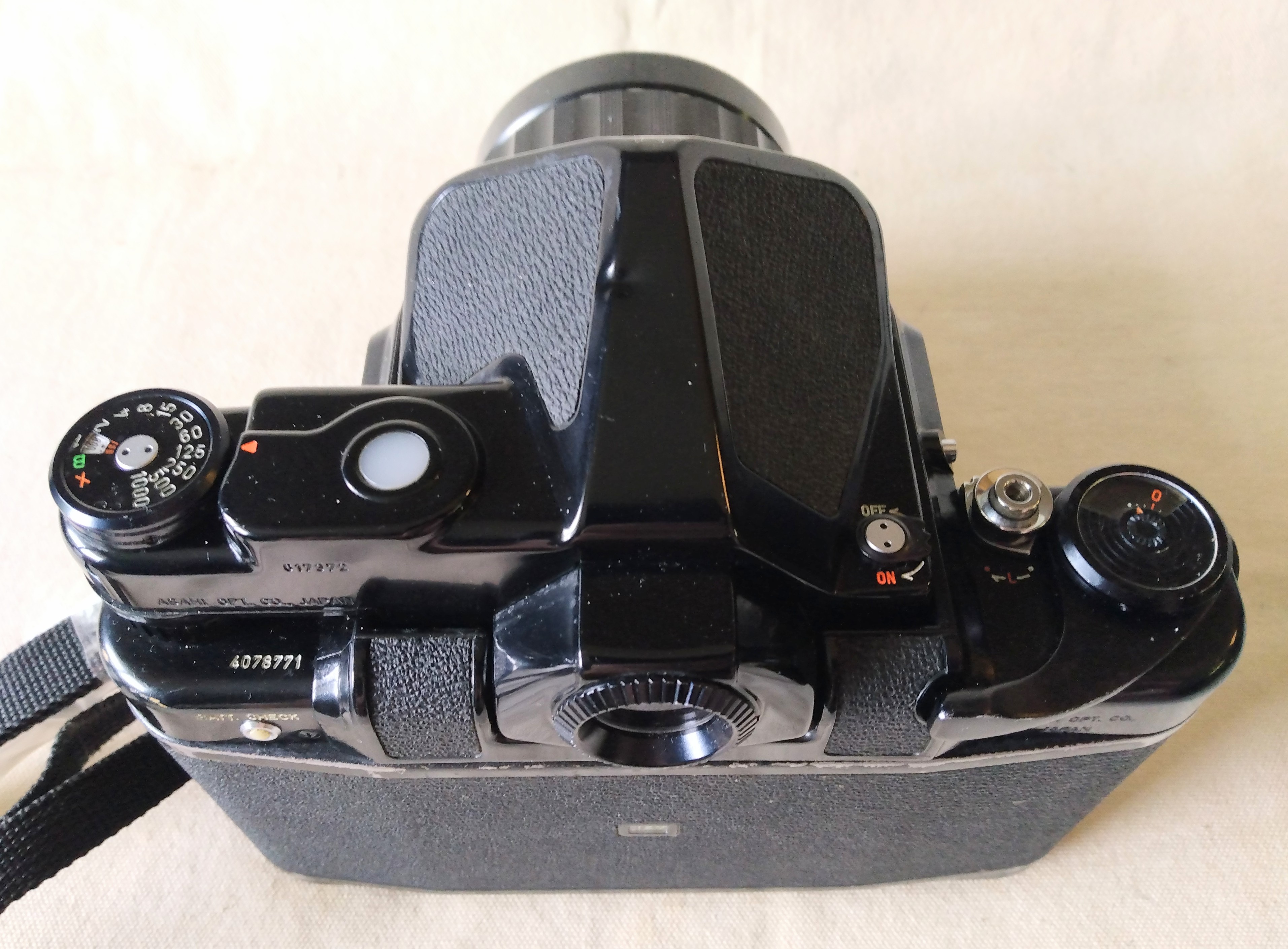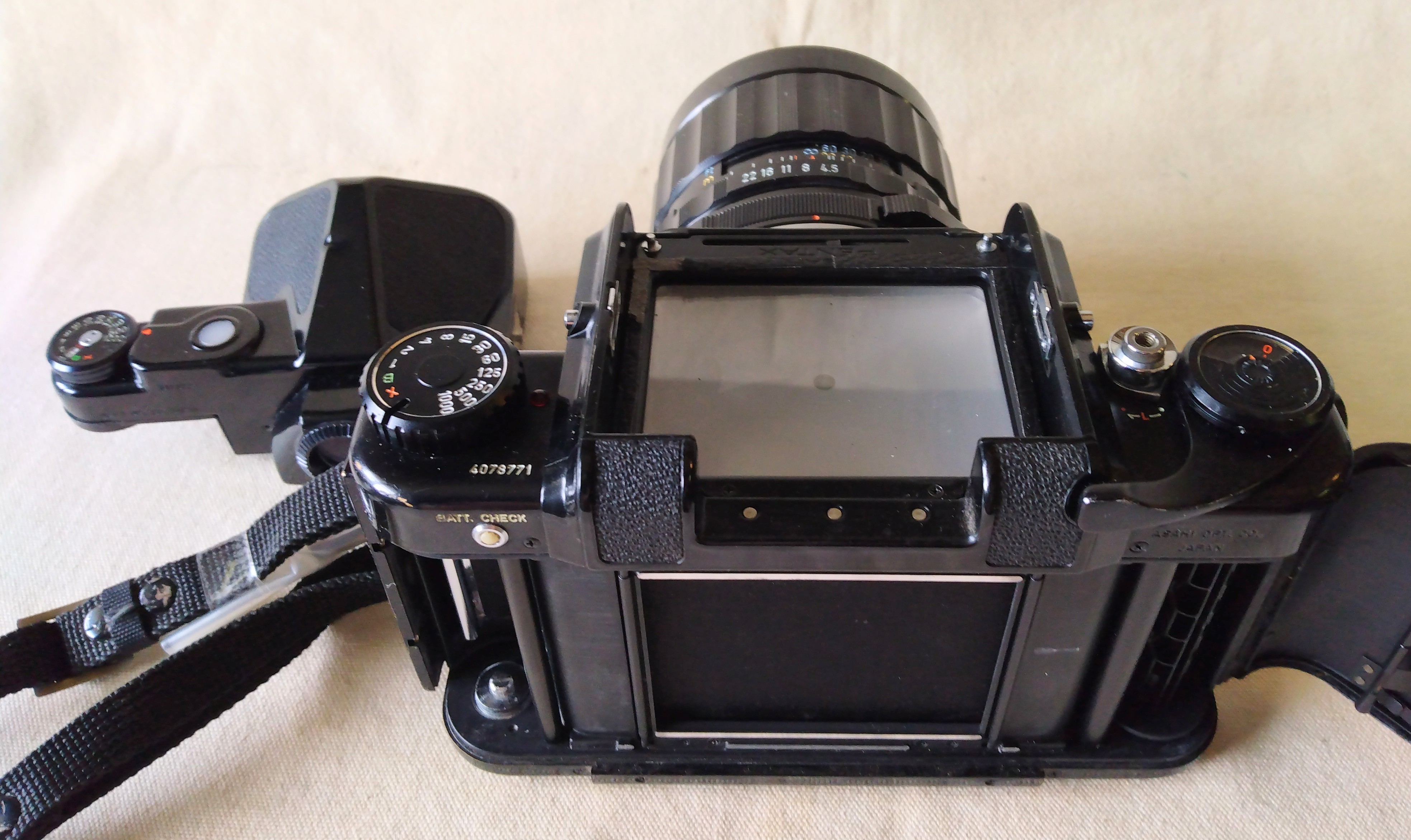 Older Pentax 6x7 body, without Mirror Lock-up. TTL finder is functional and appears to be accurate. A new battery is included (I recommend using the 544 Alkaline, and keep a fresh spare on hand; the camera seems to prefer alkaline batteries over lithium).