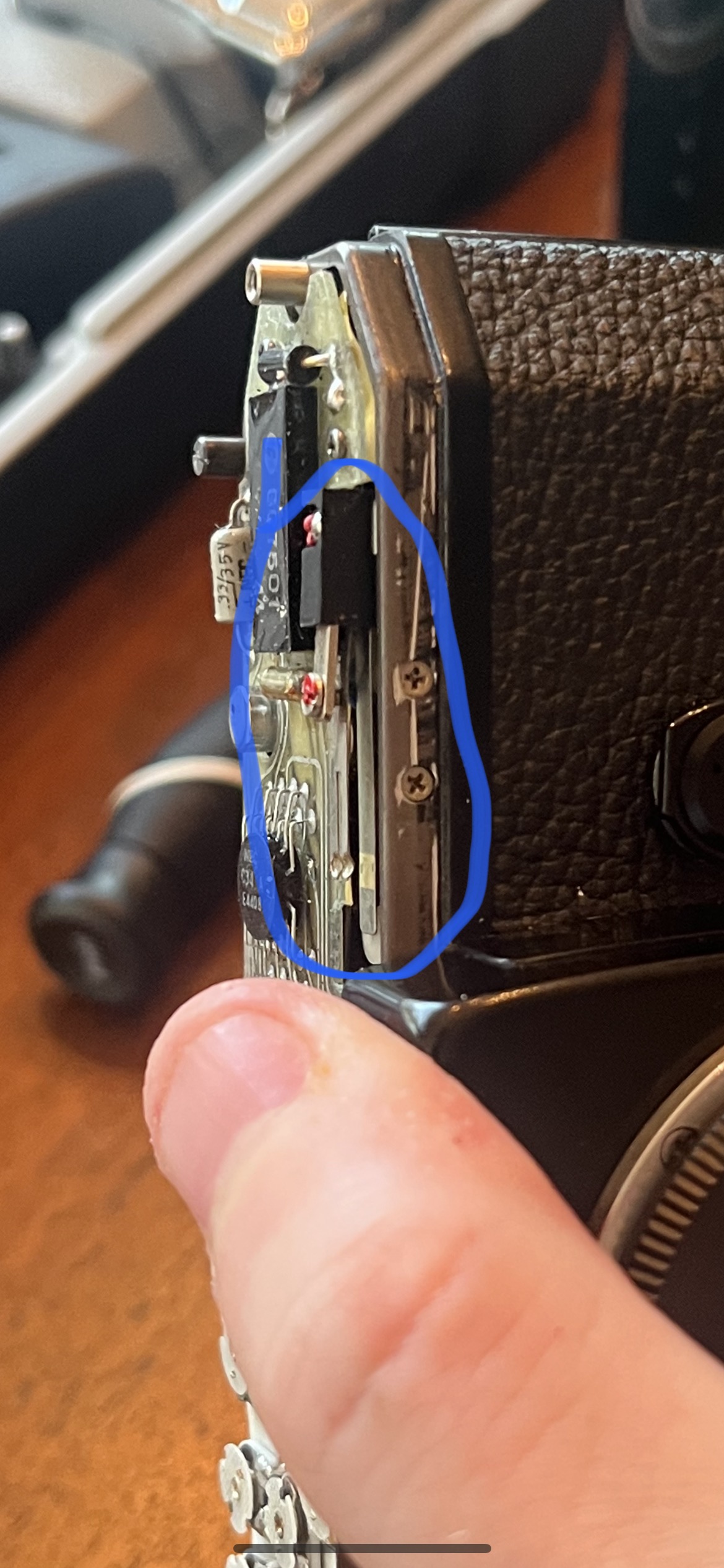 Then the second check is to see that the fork that comes across, when the shutter is open, holds a small plastic button against the contacts keeping the power on even when you let go of the shutter release mid-exposure.