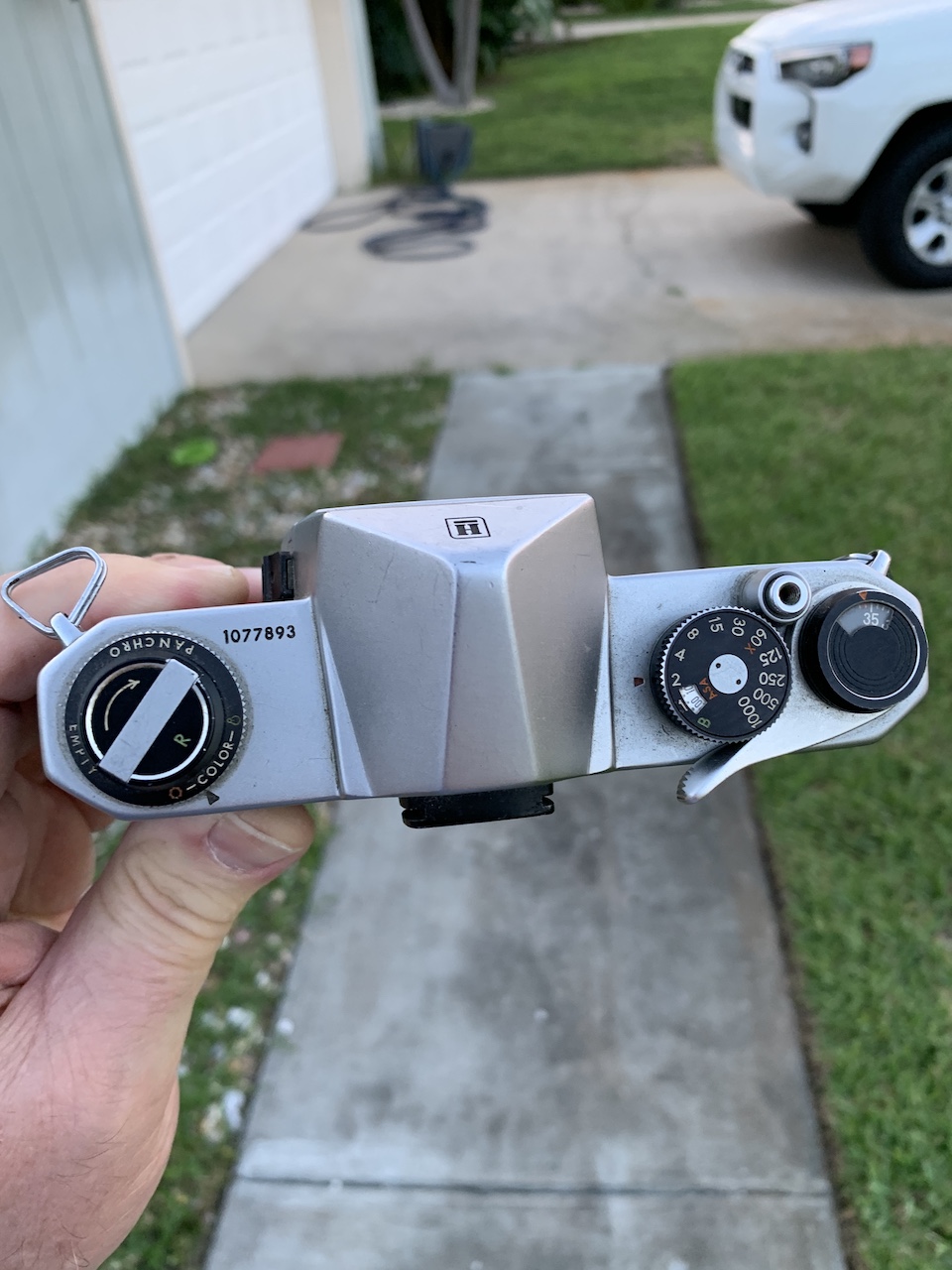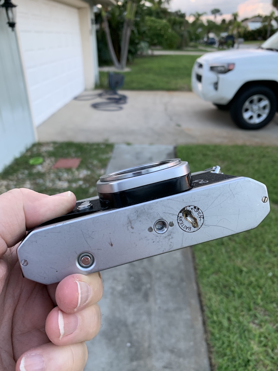 The battery compartment is frozen shut, and in fact some prior owner apparently filed or drilled a hole in it to try and open it! Therefore I do not know if the meter works or not, and I don't have at a battery to test it anyway. The X-sync flash connector is missing, so do not plan on using this with a strobe unless you can fix this. Like nearly every vintage SLR, the camera could use new light seals. The leatherette on one edge is starting to peel back (easily fixed with a few dabs of glue). Bargain priced.