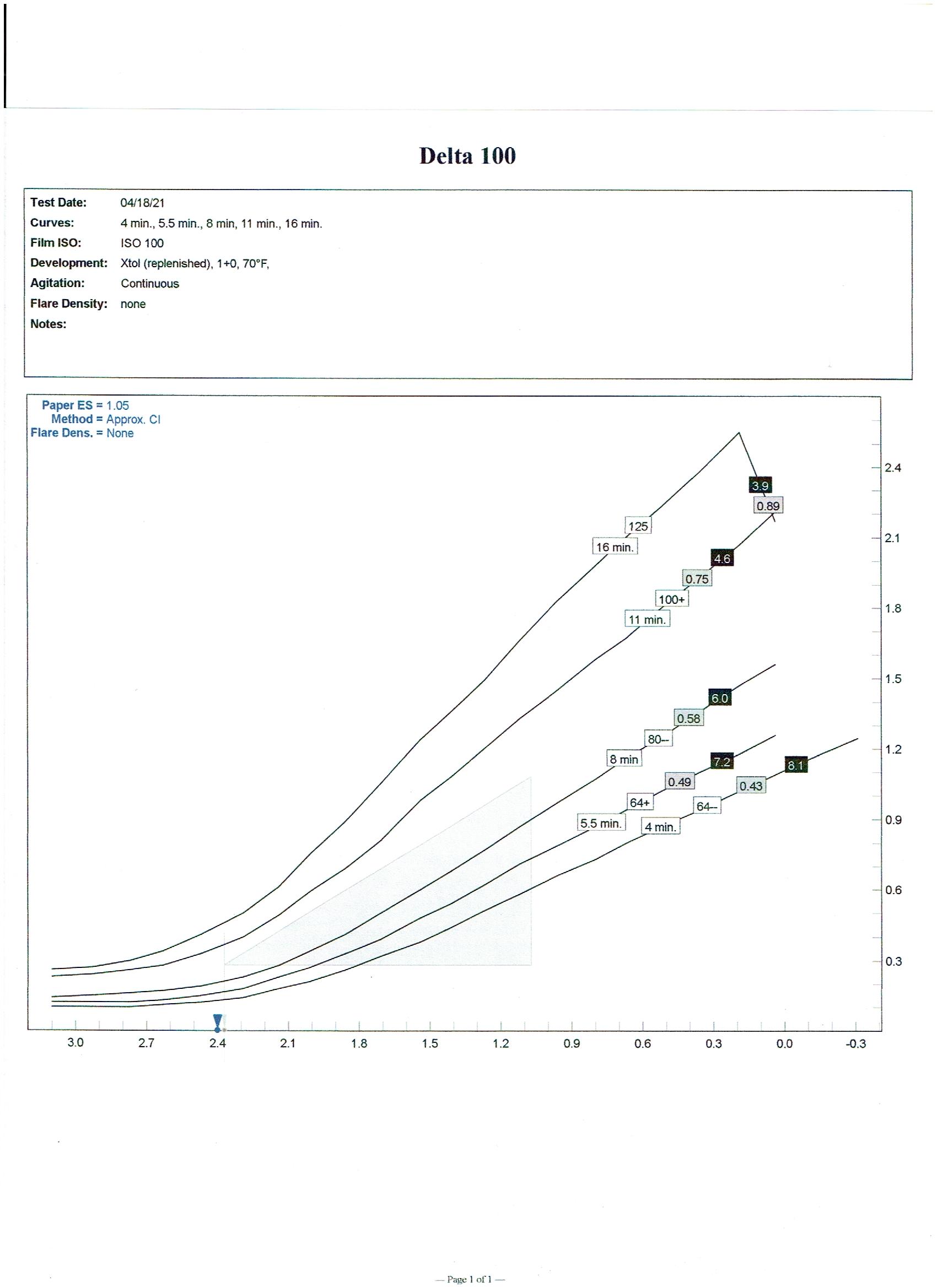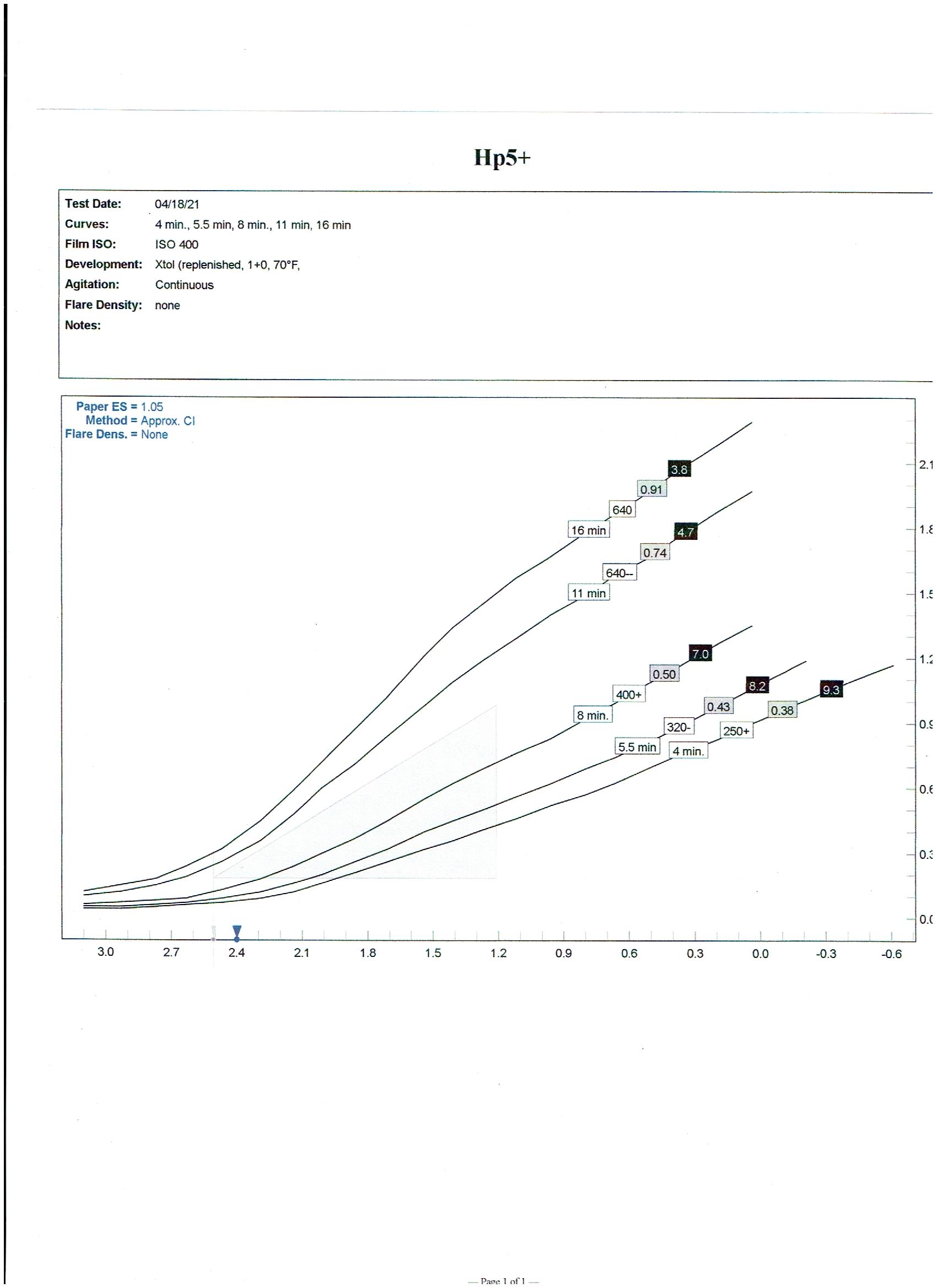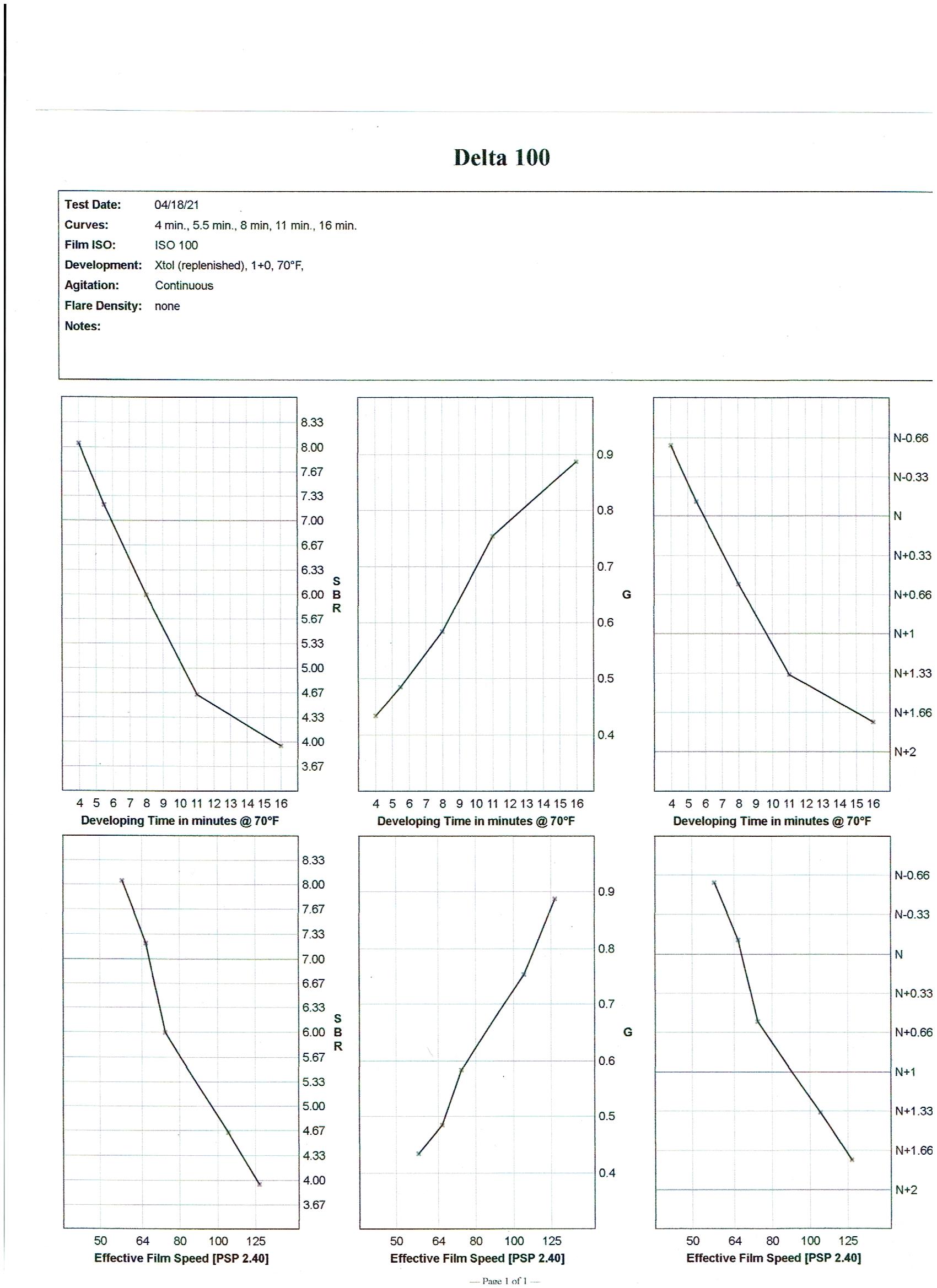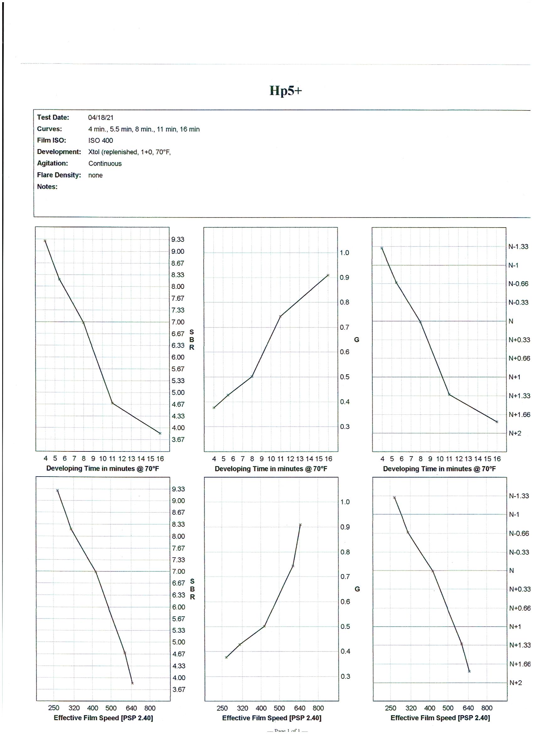 The charts below are the output from the software showing all the parameters. Ignore the 70°F in the header, it was really processed at 20°C in replenished Xtol. HP5 charts first, Delta 100 second.