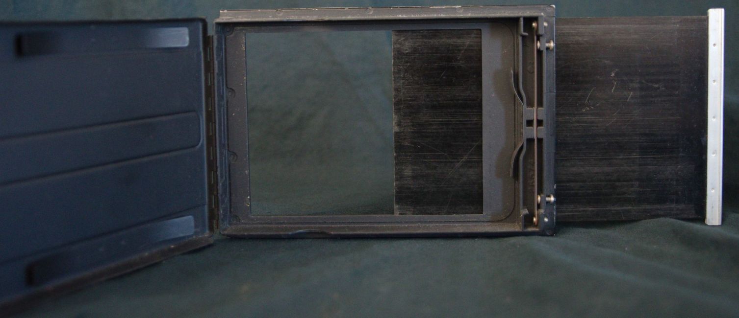 Grafmatic Film Holder #1268 with 6 septums. 'Fair' condition = a very minor dent, general use scuffing. The slide works smoothly, and the 6 septums shuffled top-to-bottom as expected when I checked the unit's operation. The unit that the slide inserts into, which one pulls out in order to load the next negative, pulls out about 1/4" when the slide is pulled. I suspect that's not ideal, but I'm not sure if that's a problem or not. One can easily eliminate the 1/4" movement with light finger pressure. $15 Sold