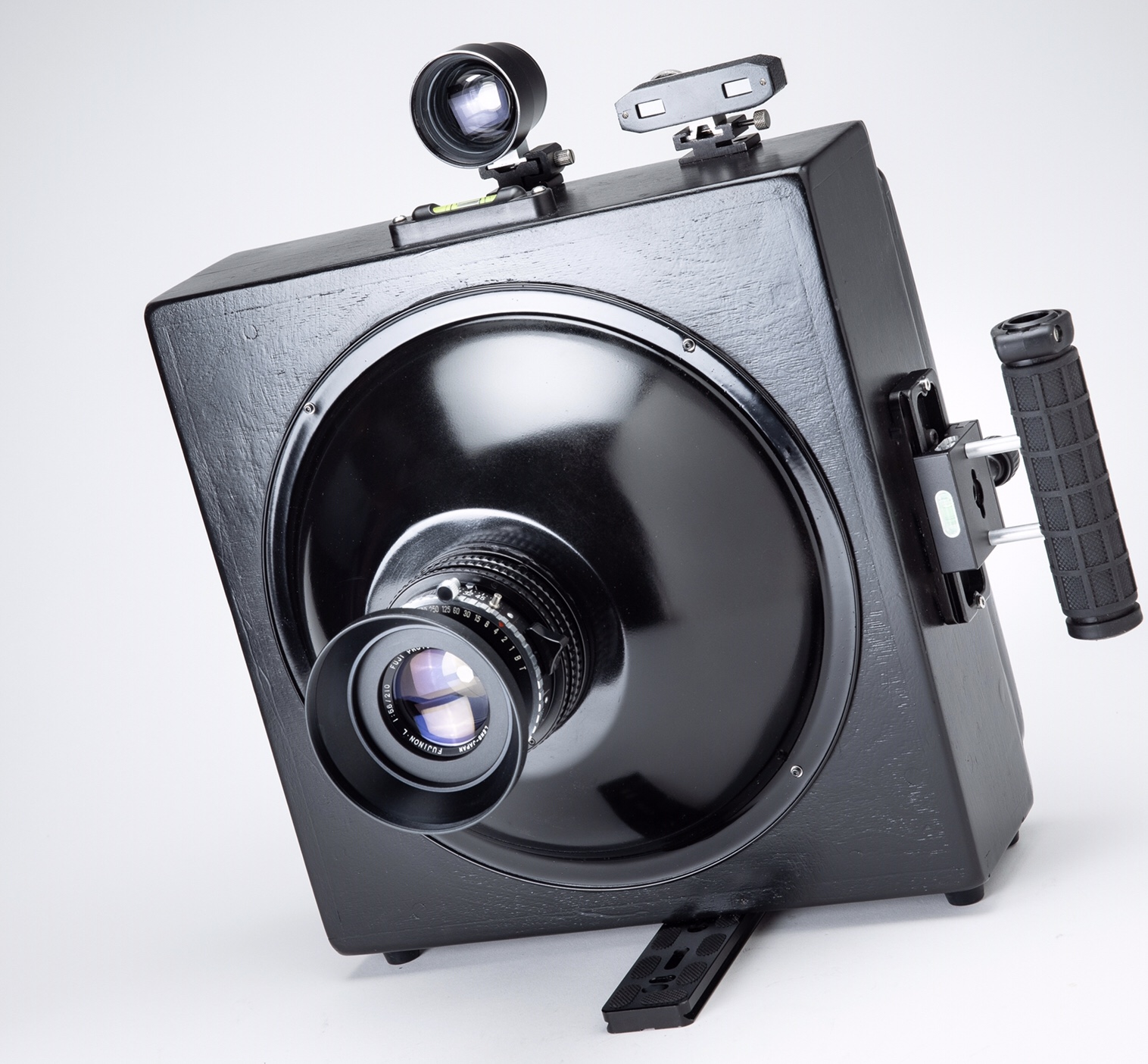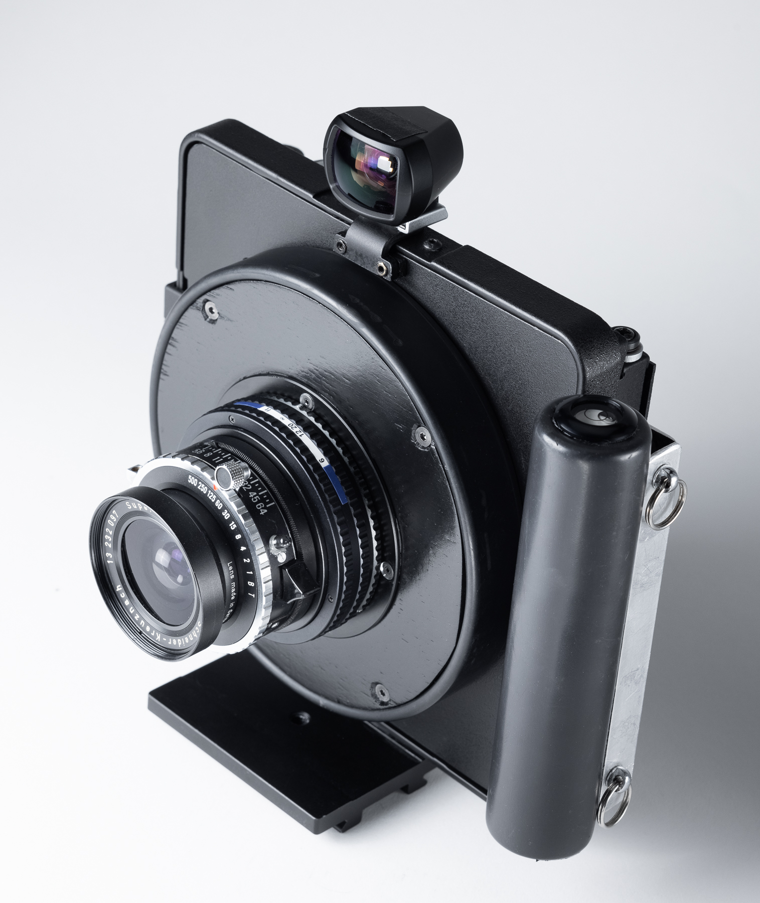 Finishing up another Covid camera, this one a point and shoot 8x10 point and shoot using a 210mm f/5.6 Fujinon L. This camera uses a Deardorff 8x10 back, has two Arca Swiss plates, one for for horizontal, one for vertical tripod shooting with a removable handgrip that is a modded Redrock Micro handle that mounts to the vertical plate for handheld use. The finder is a Koni Omega and the rangefinder is a Telex rangefinder. Second set of test sheets are at the lab.