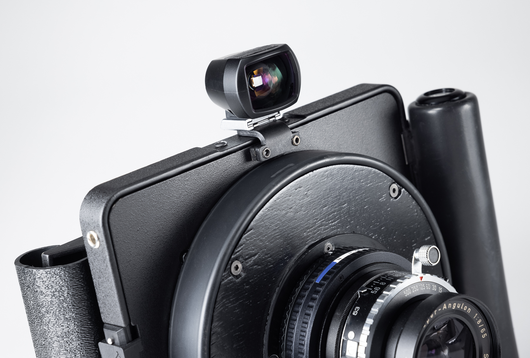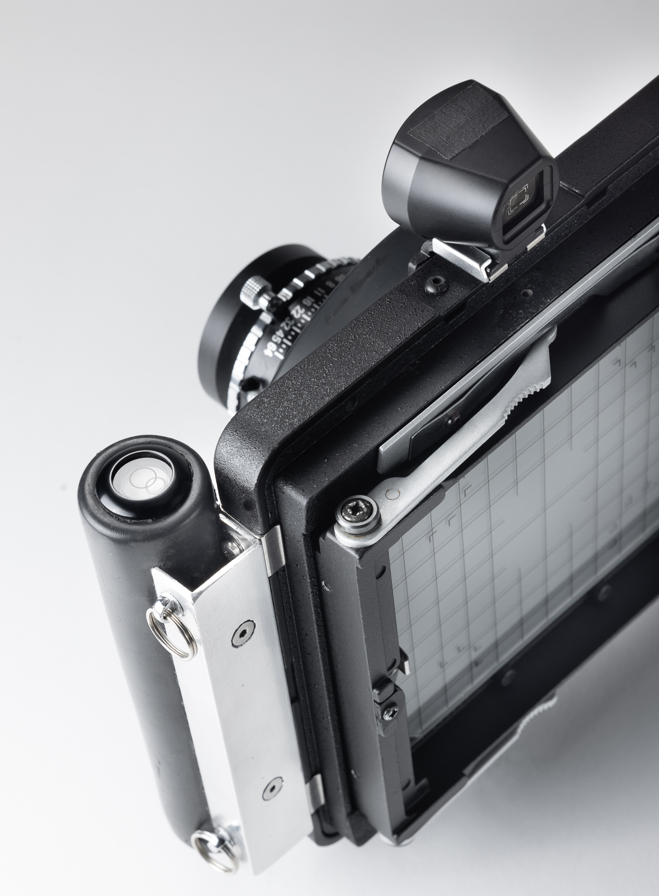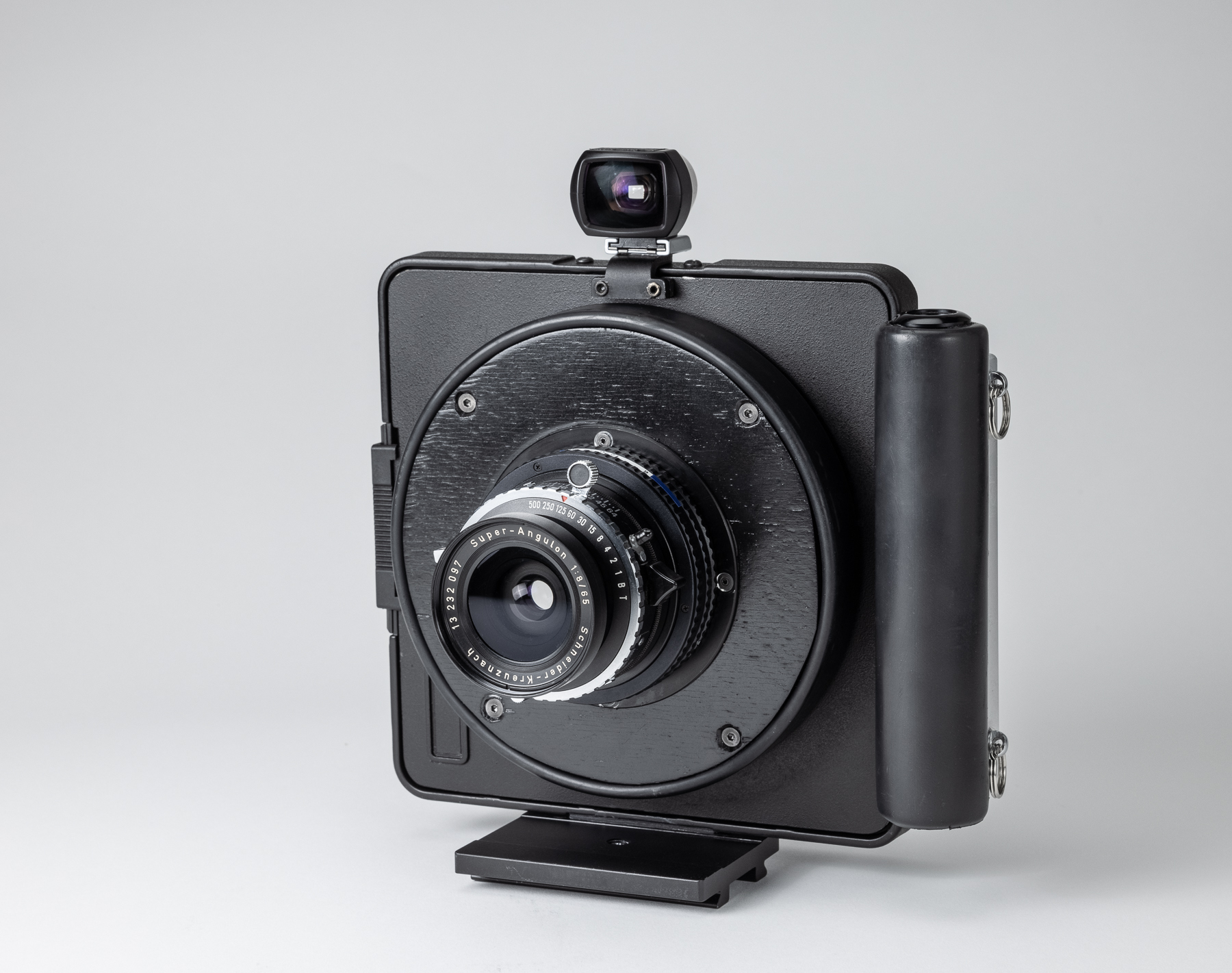 Here is a new 4x5 wide camera I finished built from a Cambo standard, lens board and GG back. The camera uses a zone focusing 65mm f/8 Super Angulon in a focusing helical and has a rotating 4x5 Cambo Graflock/Universal back. The camera has two permanently mounted Arca Swiss plates, one on the bottom and a larger 150mm plate on the side that doubles as a hand grip and a vertical tripod mounting location. A removable Russian (Russar) 20mm finder is used and mounted with enough room to allow the back to rotate.
