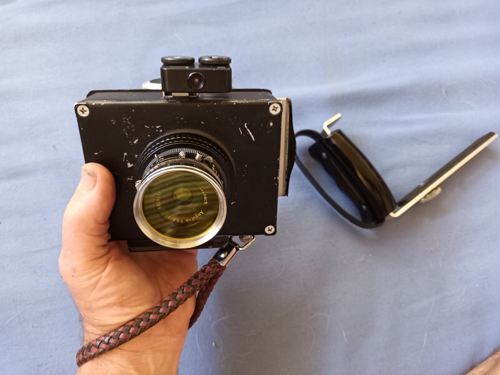 The viewfinder is kind of interesting because it was used on an old Horseman or Graflex style press view camera. It has a knob on the side that lets you zoom the view with settings for lens lengths from 65mm to 400mm for both 6x9cm & 4x5 film formats. In another "camera build" which was a real lightweight modification, I took the strap off of my ToyoView 45A II field camera, attached a couple of Camvate NATO rails to the side, clamped some handles to that & mounted the viewfinder on the top.