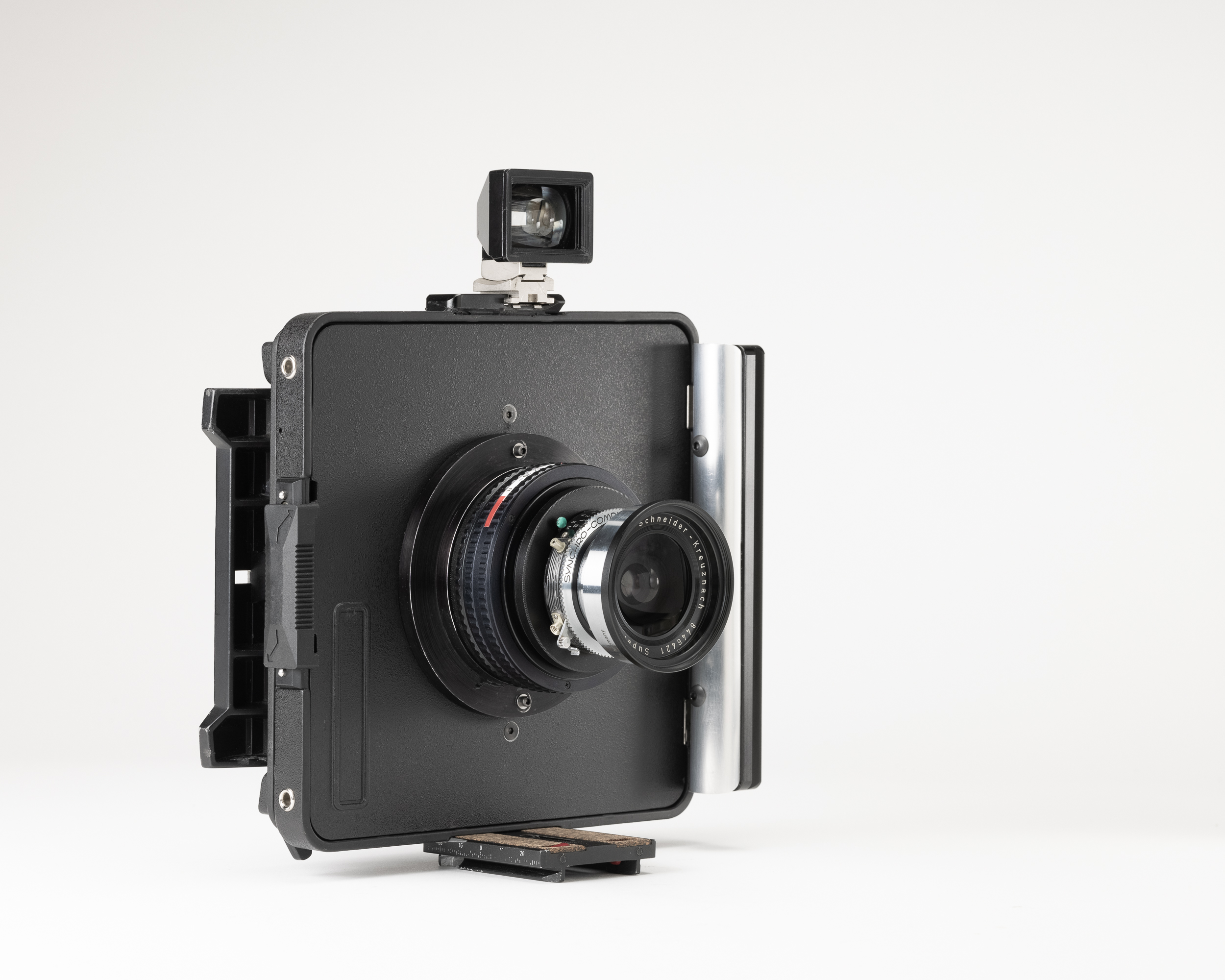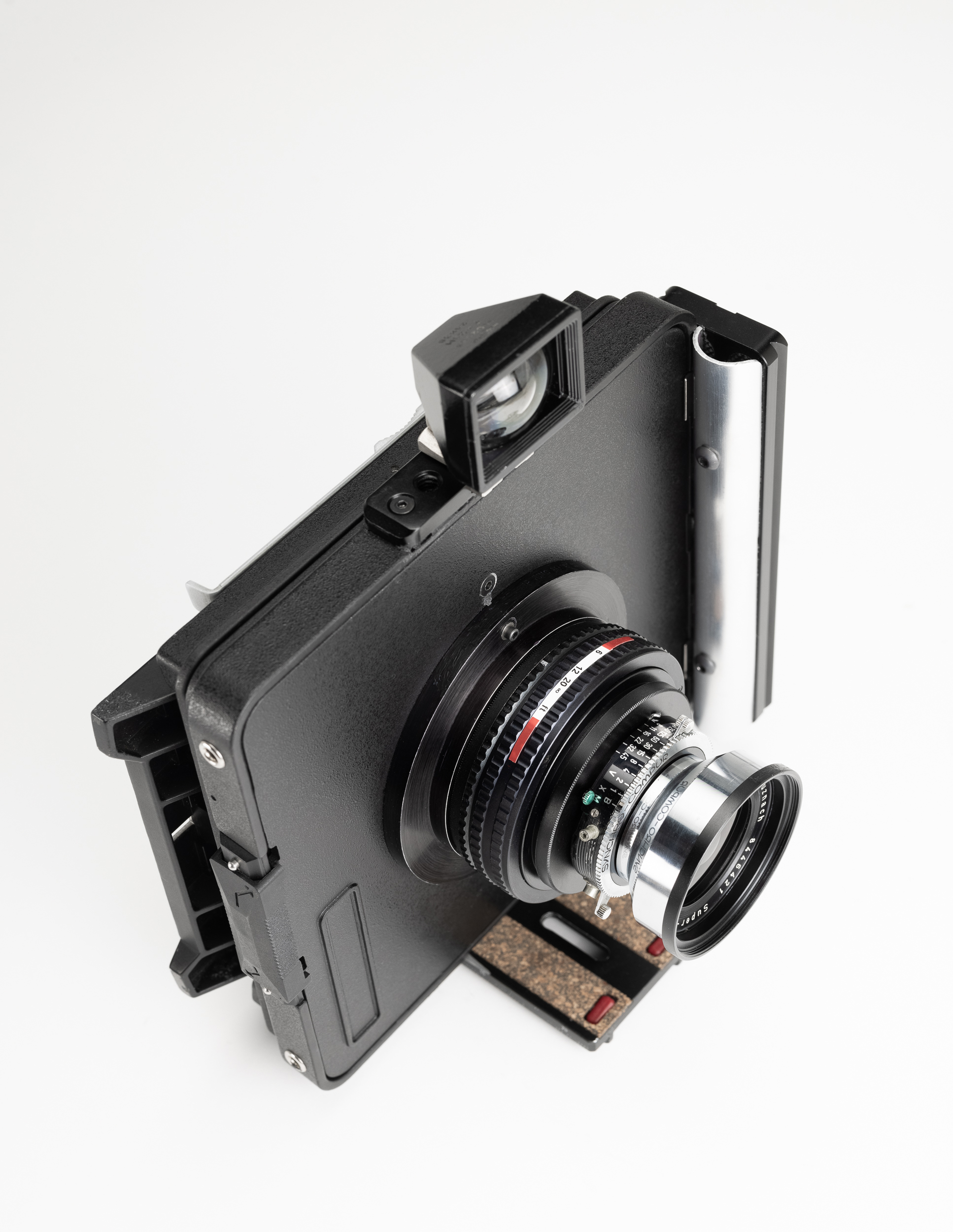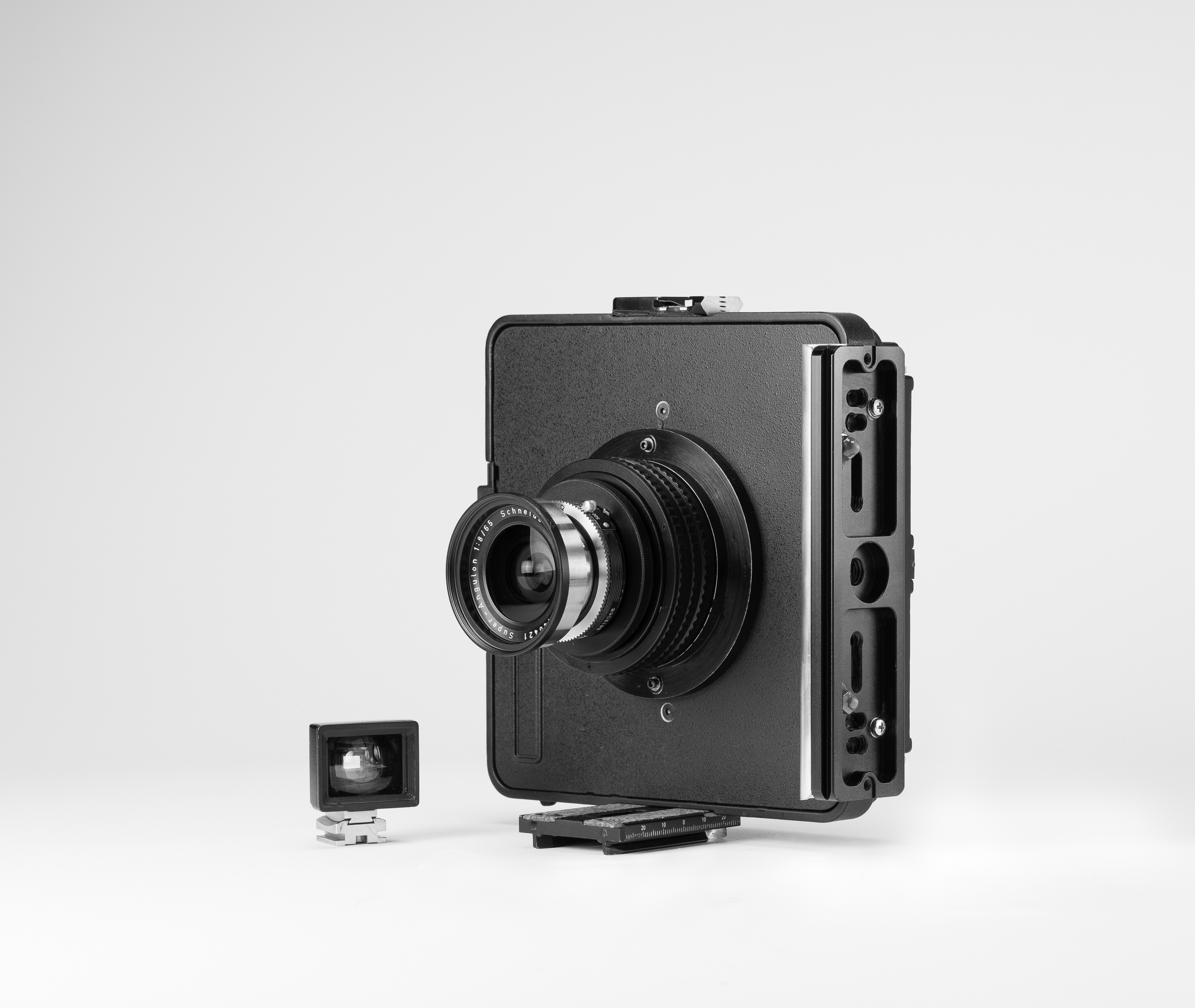 Here is a new 4x5 wide camera I finished built from a Cambo standard, lens board and GG back. The camera uses a zone focusing 65mm f/8 Super Angulon in a focusing helical and has a rotating 4x5 Cambo Graflock/Universal back. The camera has two permanently mounted Arca Swiss plates, one on the bottom and a larger 150mm plate on the side that doubles as a hand grip and a vertical tripod mounting location. A removable Russian (Russar) 20mm finder is used and mounted with enough room to allow the back to rotate.