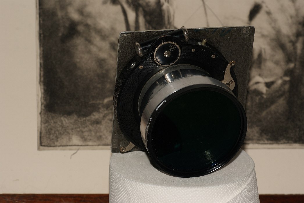 Filterholder for the good old 9x12cm Plattenkamera, locked with a screw instead sticking of the threadless 135mm lenses: