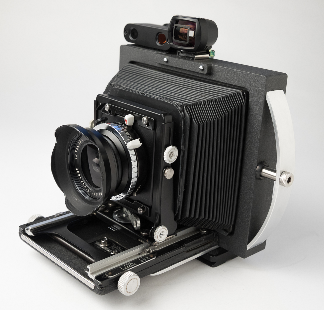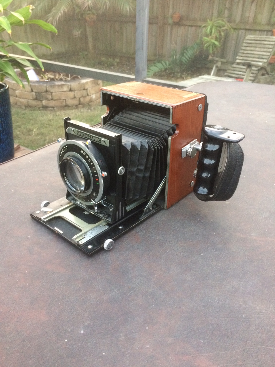 The camera can use 65mm to 203mm lenses, it's fitted with a 1913 120mm Dagor in the photos. With a 203mm f7.7 Ektar it focusses to 6ft., Final weight is 1.25kg.