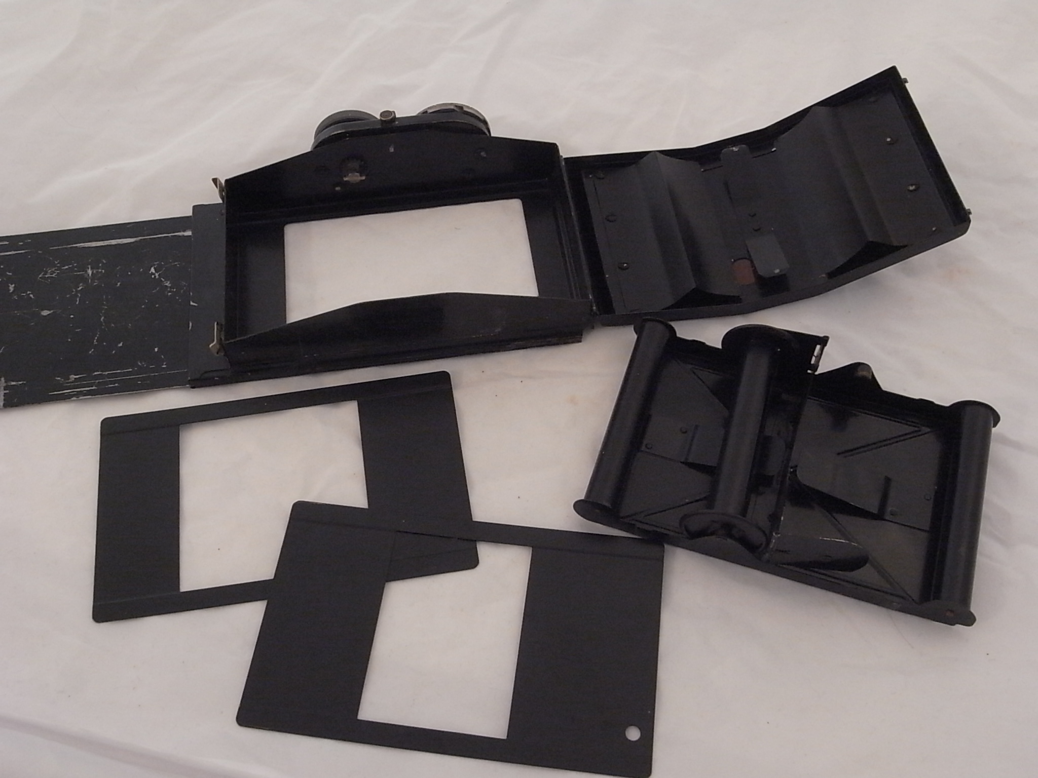 I've added a 120 film back to the camera, there are a few different styles and this is one of the earliest ones. The film back comes with the original format masks as seen in the pictures, so the back can take 6x9, 6x6, and 6x4.5 format negatives ( I don't know how you tell when the smaller formats are wound for each shot, but the film back has a window so maybe you watch for the numbers). The winder on the back works and stops at the index marks (this is for 6x9cm). The dark slide moves well.