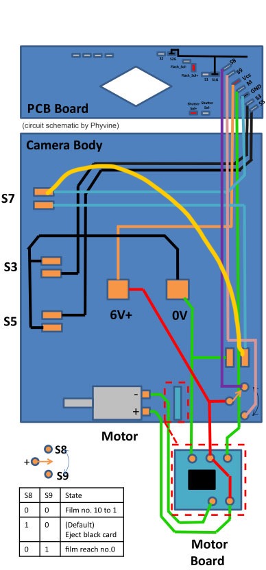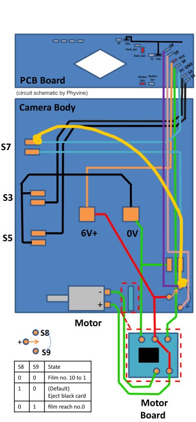 I had to replace the large body ribbon cable at one point and fear I may have slightly damaged a connection in some way during other tweaks. In its current state, the camera only works if there is a wire soldered between the highlighted contact and the S7 negative contact (see the yellow on my sad diagram). The weird consequence of this is that if you insert a film pack it will trip S7 immediately before even closing the front roller door and eject the dark slide. This is very easy to work around - the camera works totally normally otherwise, but I am concerned about potential battery drain and would rather the damn thing just work right.