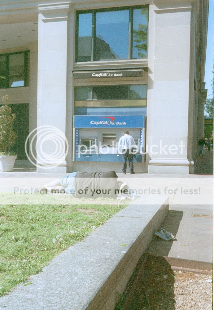 Here's a photo of mine that shows what I'm talking about. I was in a library and afraid to pull my camera out and actually take pictures, so I put it on a table and shot instead. The man in the picture was horribly frustrated, out of work, and trying to find a job. My image conveys none of that. Street is about being intimate, and I didn't have the balls to get intimate with this shot. I kick myself for not being able to perform in situations like this. What am I really afraid of?