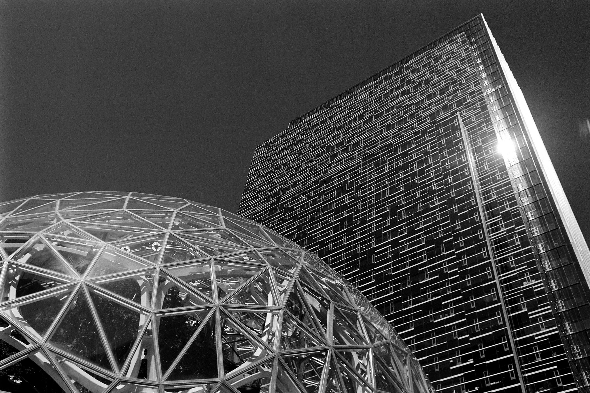 Amazon Sphere and Amazon office building in Seattle, Washington. Leica IIIf with Summaron 3.5cm, yellow filter. The film is expired Kodak Panatomic-X developed in Beer.