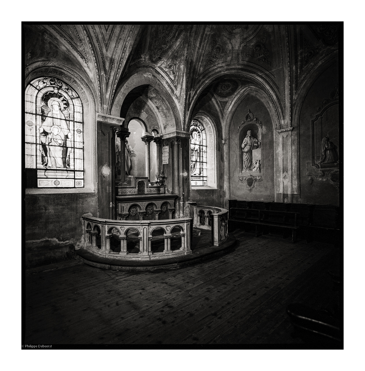Early Neo-Gothic interior with grisaille trompe-l'oeil and wood floor (!) in a side chapel, Eglise Saint-Lazare, Avallon, Yonne, France.