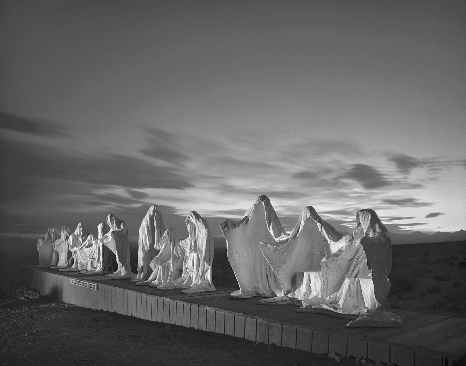The image was shot at dusk facing west. The illumination on the sculpture is from display lighting. This is just one of a number of sculptures placed around a small house on the outskirts of the ghost town of Rhyolite.