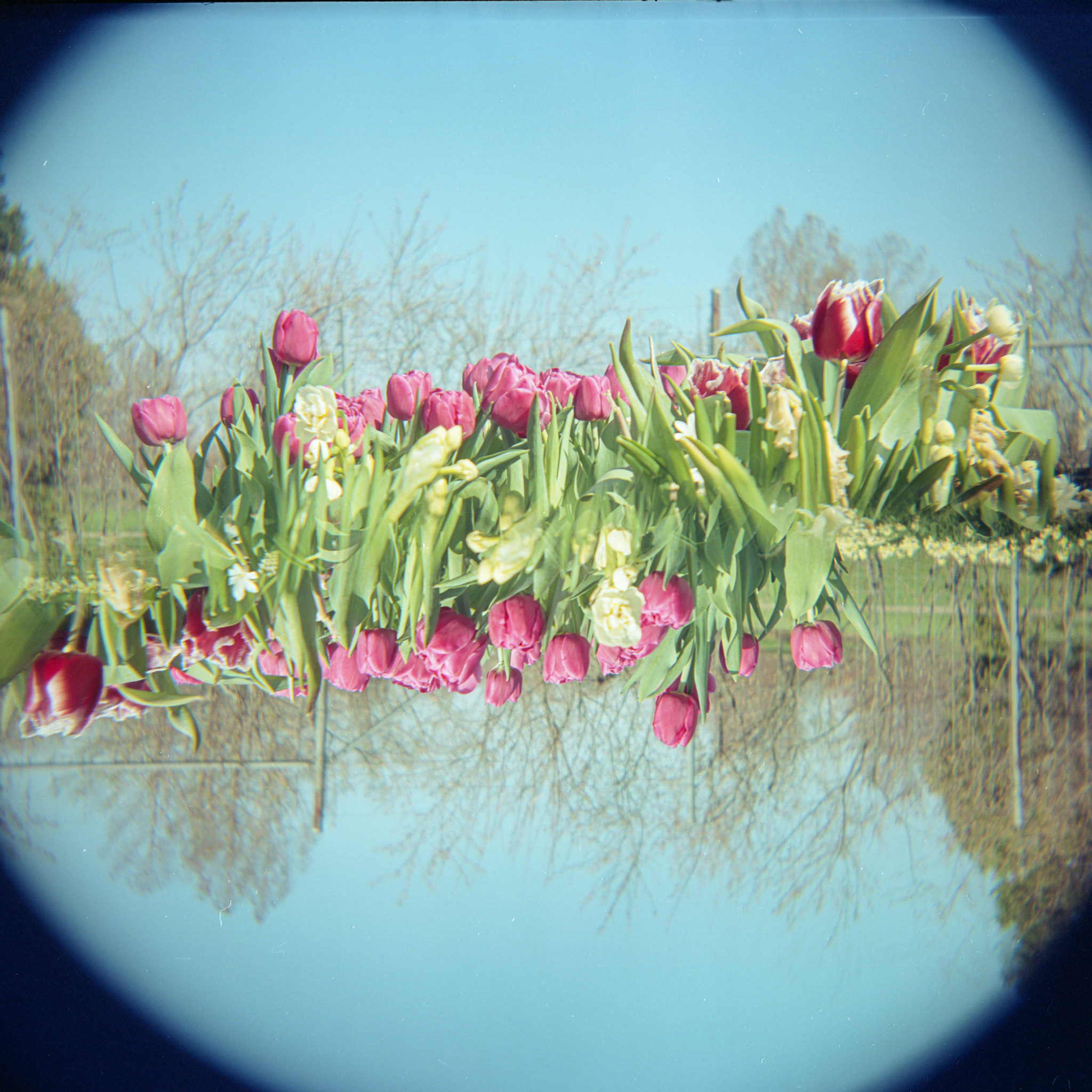 Here's one from this past summer. Holga 120N on Portra 400. Vivitar variable lens cap with 1/2 the image covered. Top image first with bottom covered, then flipped camera upside down and covered the bottom to take the second image.