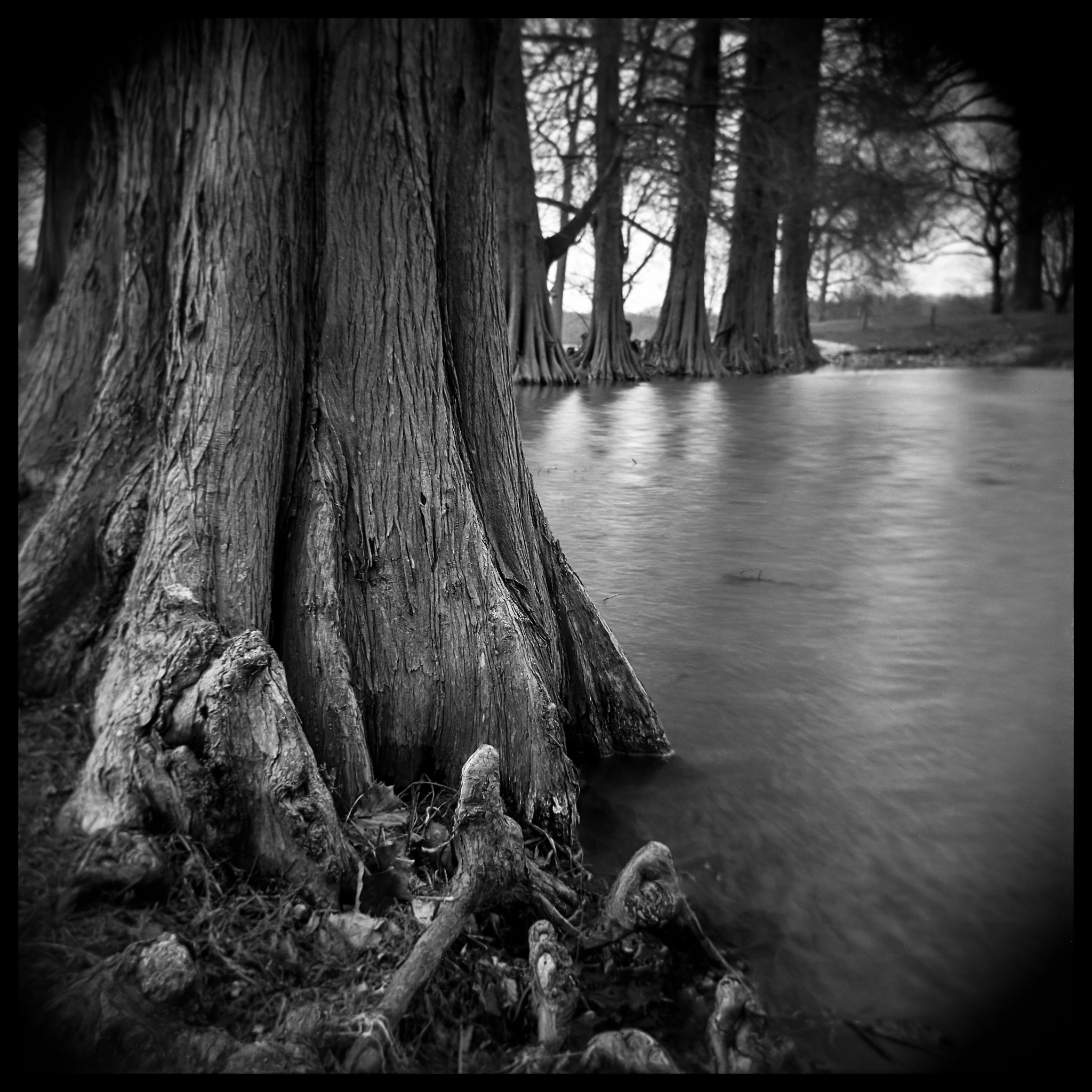 Cypress Trees - Fuji ACROS film @ cloudy setting, approximately 1 second exposure on a tripod.