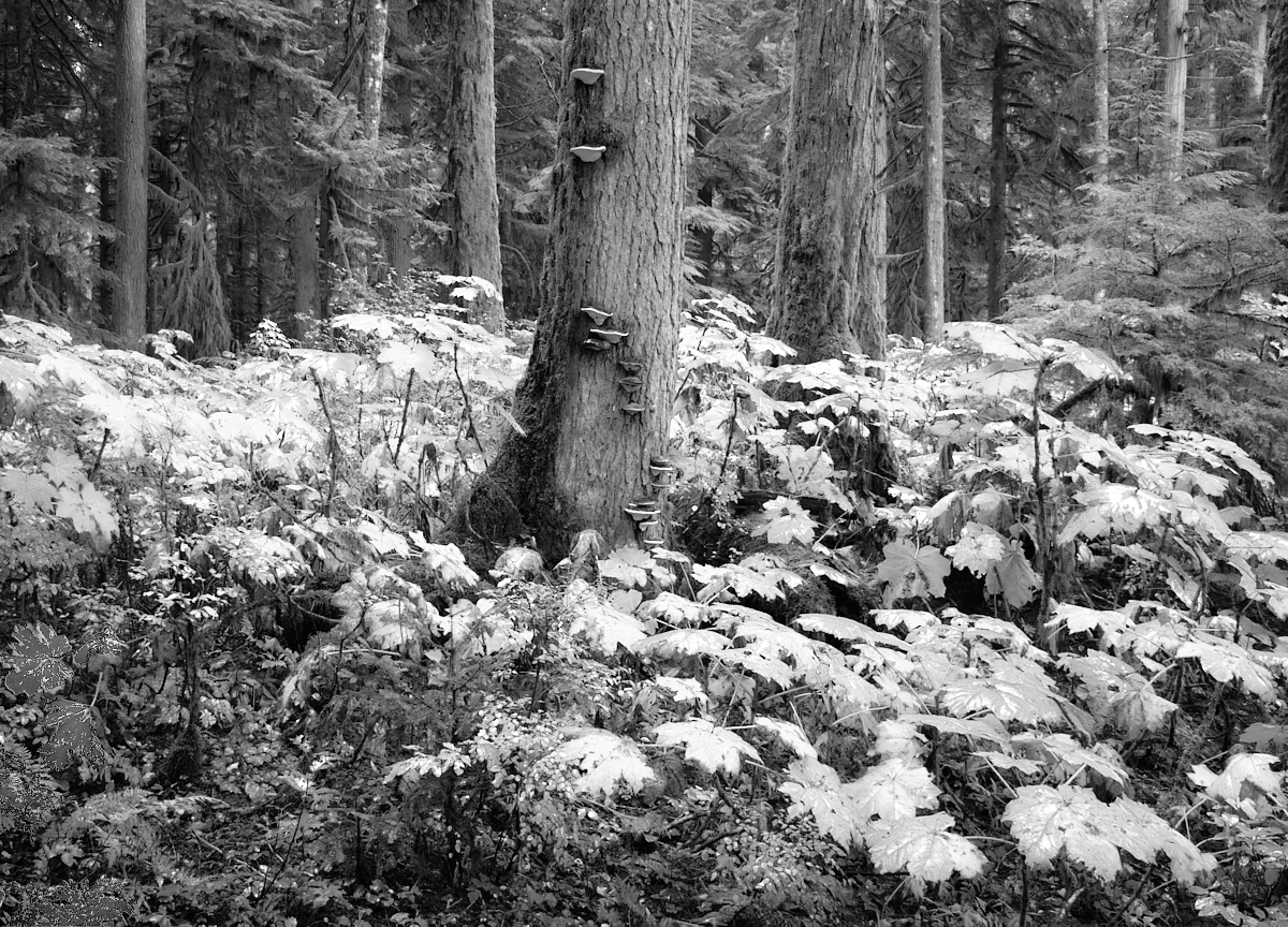 A creek to right allowed some light in, Devils Club and ground cover starting to turn fall colours and wet from light rain, a Hemlock starting to decompose while standing, and one second of photon absorption.