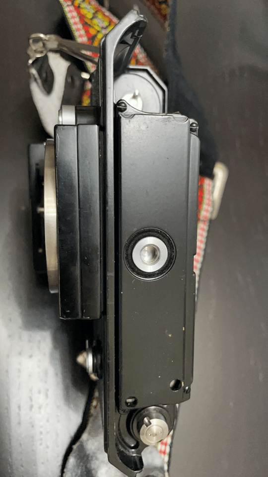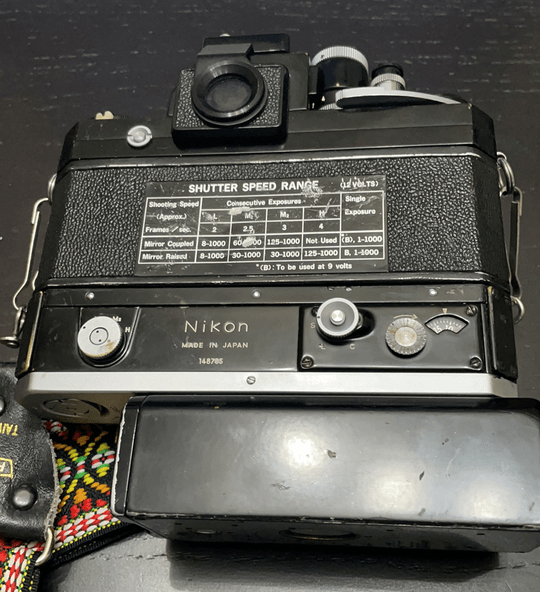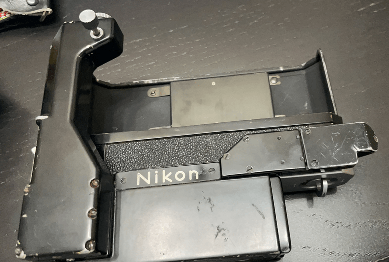 Nikon F black with Ftn finder and F36 motor drive with cordless battery pack. SN 7078643 which is a later one but is not an Apollo one. Body in good condition for age, minimal brassing.