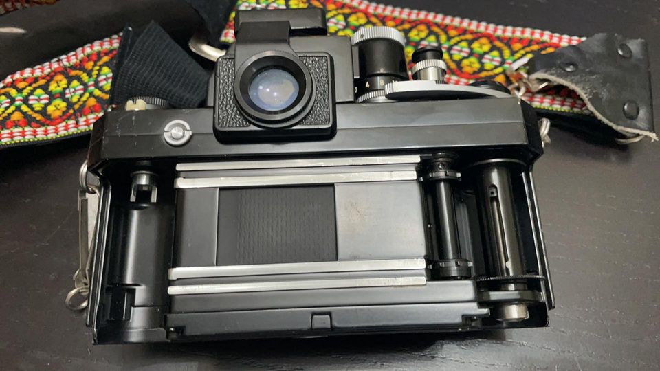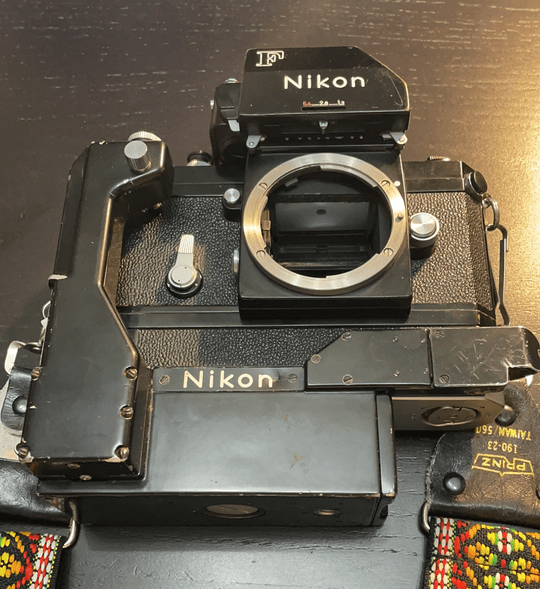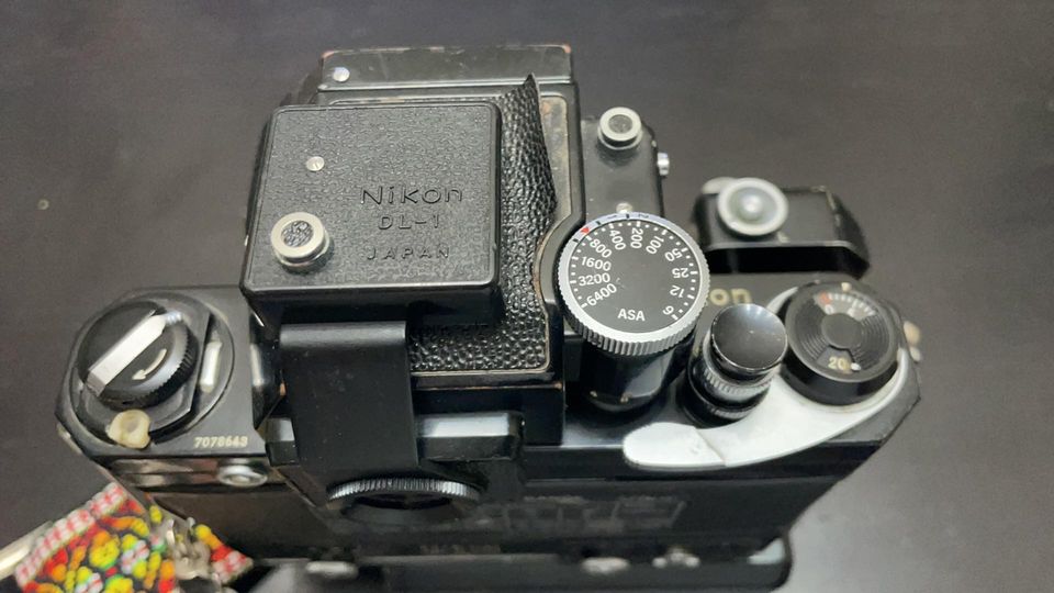 Includes F body, F36 motor drive, cordless pack which has the connection part that is often missing when you get one, DL-1 which lights up the meter needle at night so you can see it, body cap, and a period correct nos strap. Some peeling on the top of the finder but can be glued down. The non-motorized back is also included, as well as the AR-1 release.