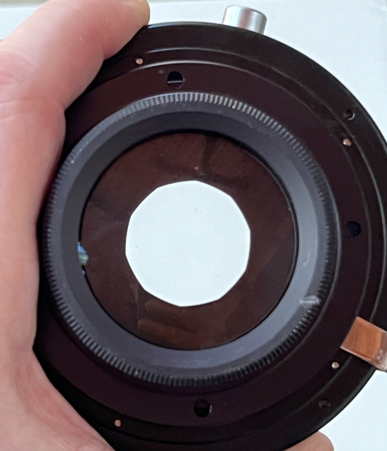 This very clean 300mm f/6.3 Komura Commerical is in an older-style Copal 3S (marked "Copal No. 3") shutter, the kind with non-equal spacing between the full stops. There are no obvious problems with the glass and the exterior is in good condition with only minor marks of usage save for a nick in the rear cell housing - in the photos I aligned the aperture-setting lever with where the nick is. The shutter operates correctly and repeatably although the slow speeds sound a bit slow. It comes with a Rodenstock front cap and a mounting flange, not a two-piece mounting ring set. Also included is a metal Komura lens shade that screws into the 72mm filter threads.