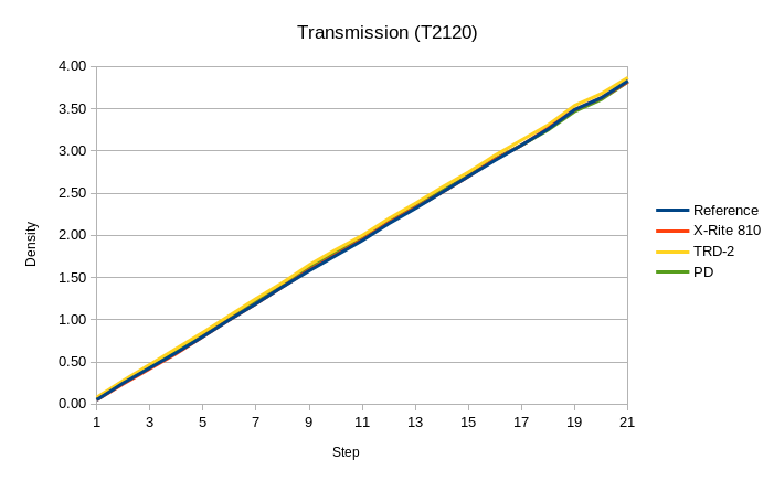 For transmission measurements, I'm only just getting started with testing. I recently ordered a collection of materials from Stouffer to help fully test and compare transmission performance, and they should be arriving soon. The software for it is all written, and works in theory, but I still need to actually compare side-by-side graphs of step tablet measurements to be sure.