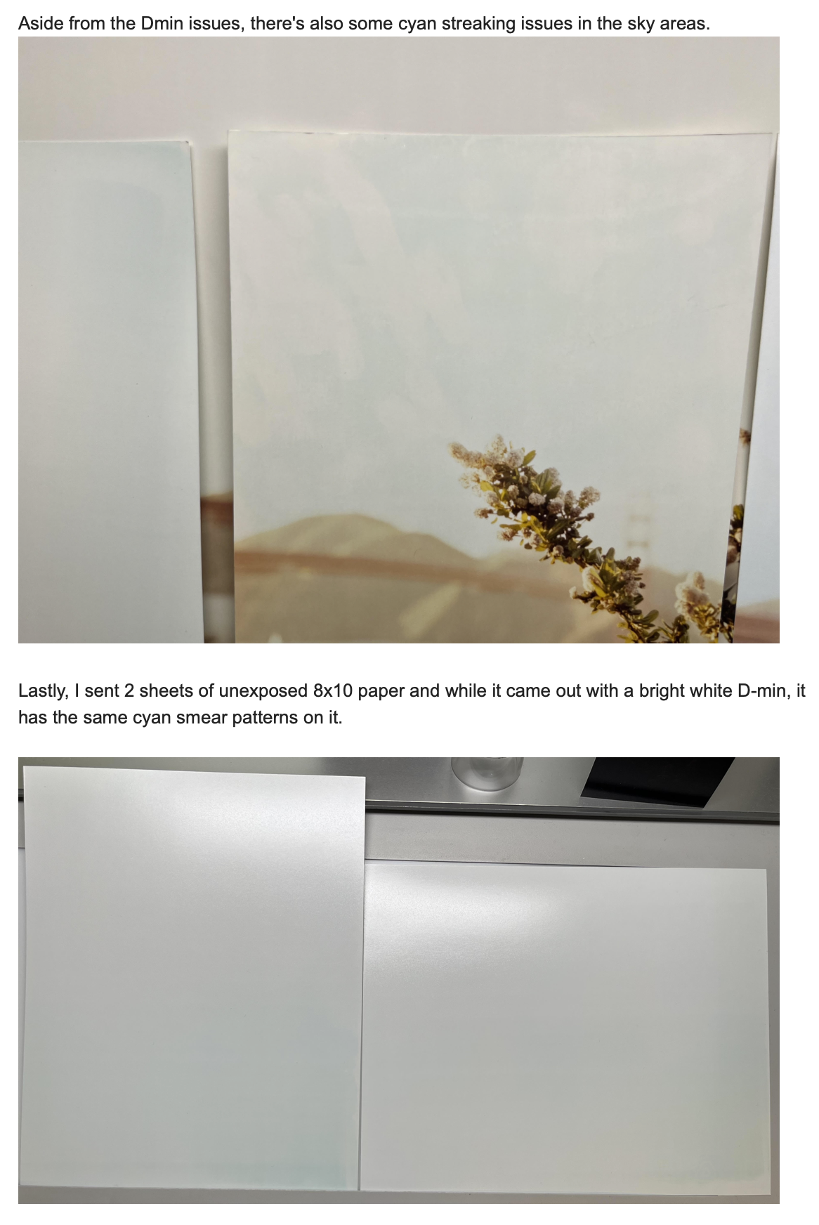 You could try lowering the pH of the BLIX gradually. Although difficult to measure pH in a colored solution, you could add measured amounts of glacial acetic acid (be careful with it!) starting with a liter (make sure mixed in completely) and then a second liter. Without knowing the actual BLIX tank capacity nor the outcome of the first test at a liter this is only an estimate at a distance. You could always backtrack the pH with some KOH if the pH lowering makes the chemistry go south.We also ruled out chemical contamination as we had mixed everything fresh and the cyan smearing was still ever present. Adding glacial acetic acid to the blix bath completely solved the smearing, though it took us some trial and error to figure out the least amount we had to add. We arrived at adding 50ml of glacial acetic acid per 4.5L of blix (our processor's tank size).