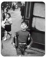 The boy carrying bottles was taken by HCB on Rue Mouffetard in 1954. Not Doisneau.