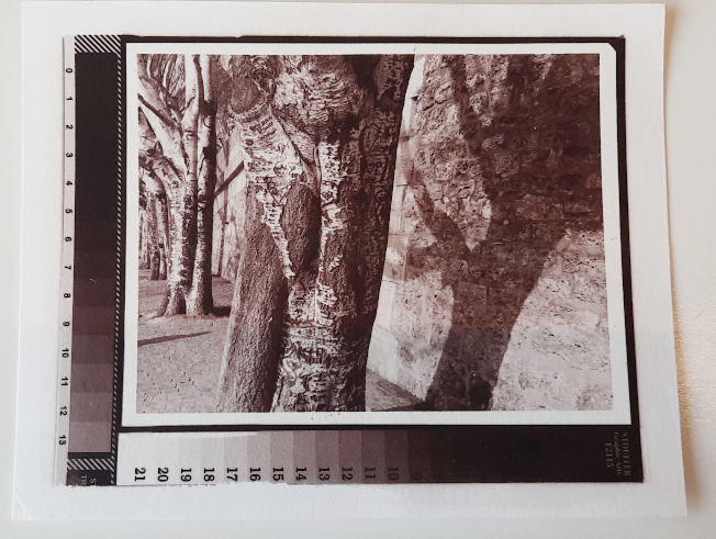 This print was partially gold toned; dmax is around 1.35logD (darkest patch top left). By comparison, untoned Adox MCC112 matte silver gelatin developed in ID62 maxes out at around 1.45logD.