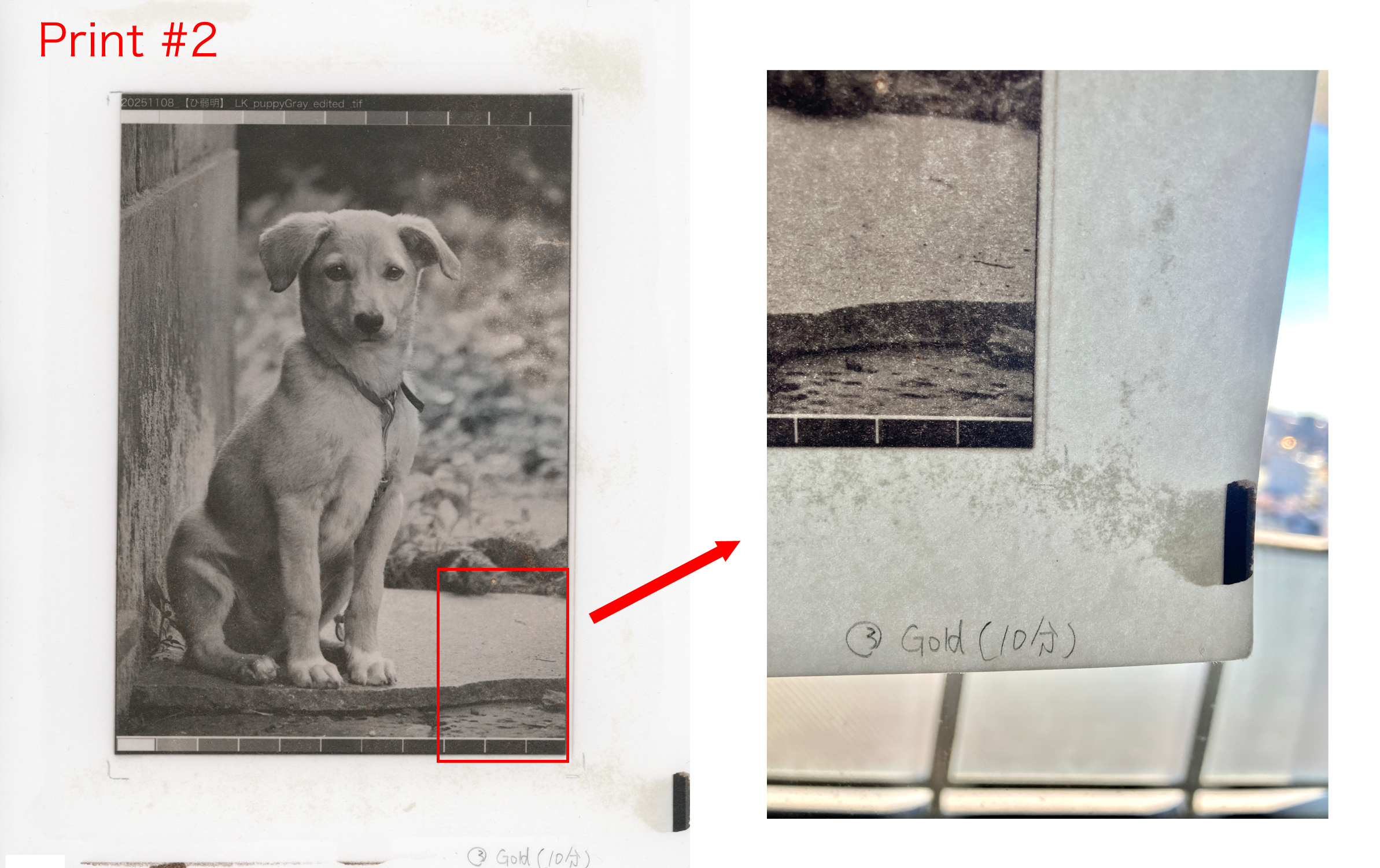 This time, no fog appeared before UV exposure, but after gold toning (gold-borax) fog showed up in the margins. Under transmitted light, I can see excess silver remaining in the paper.