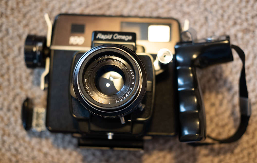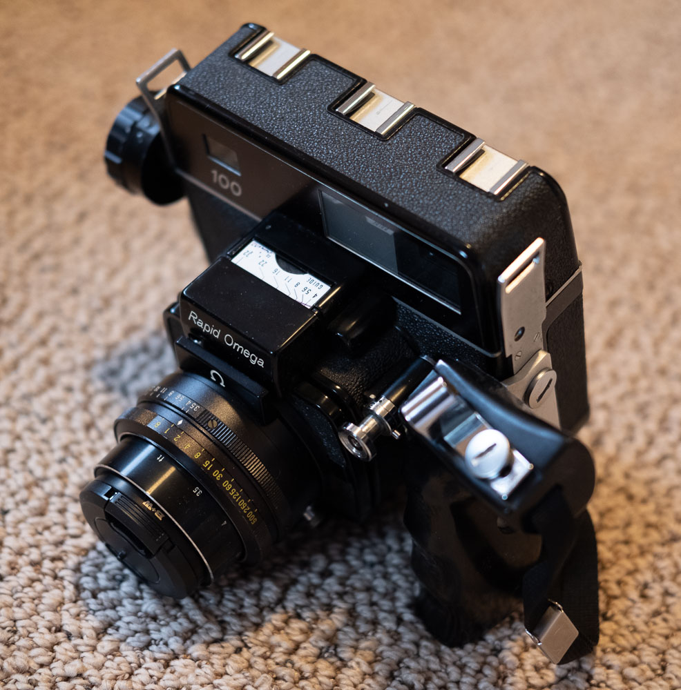 - Rapid Omega 100 body with handgrip, two 120 film backs, bonus 220 film back, and 90mm f3.5 Omegon (adapter ring has been removed and the lens now accepts 49mm filters): $200 + shipping/insurance.