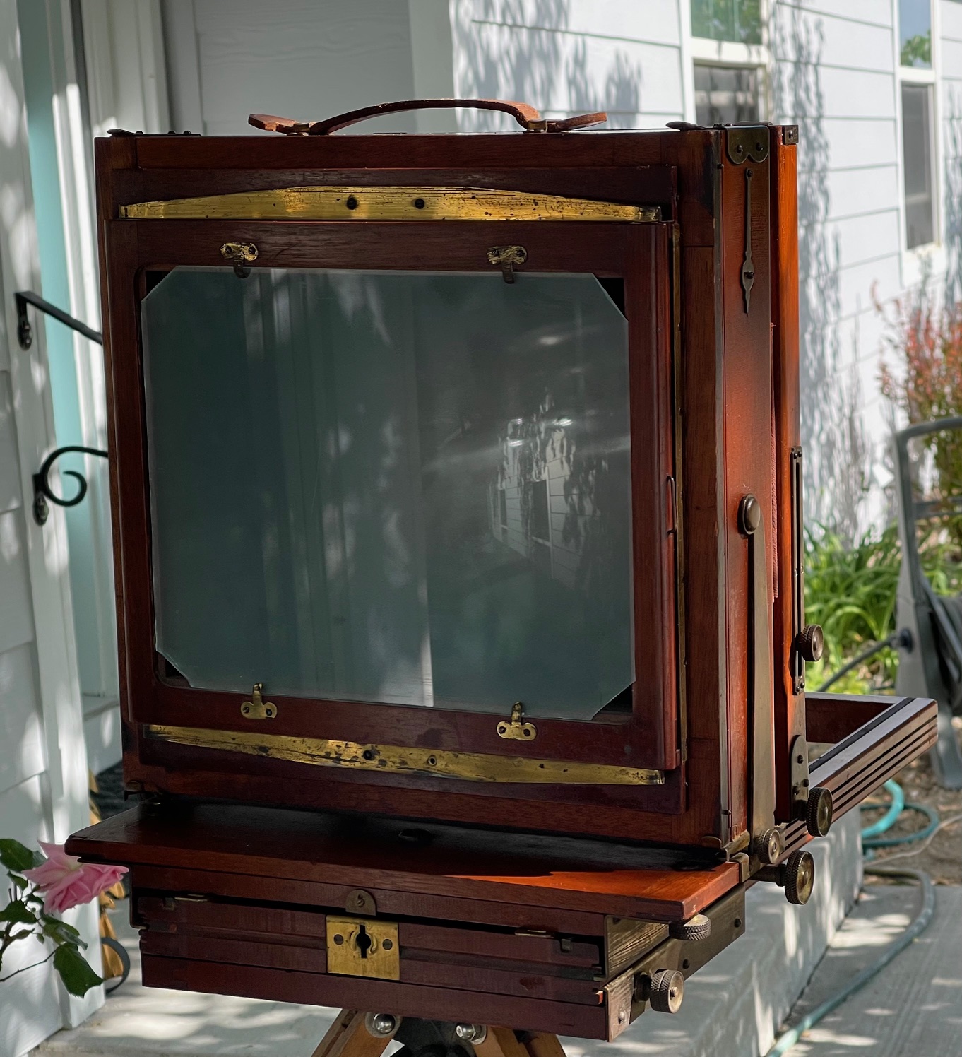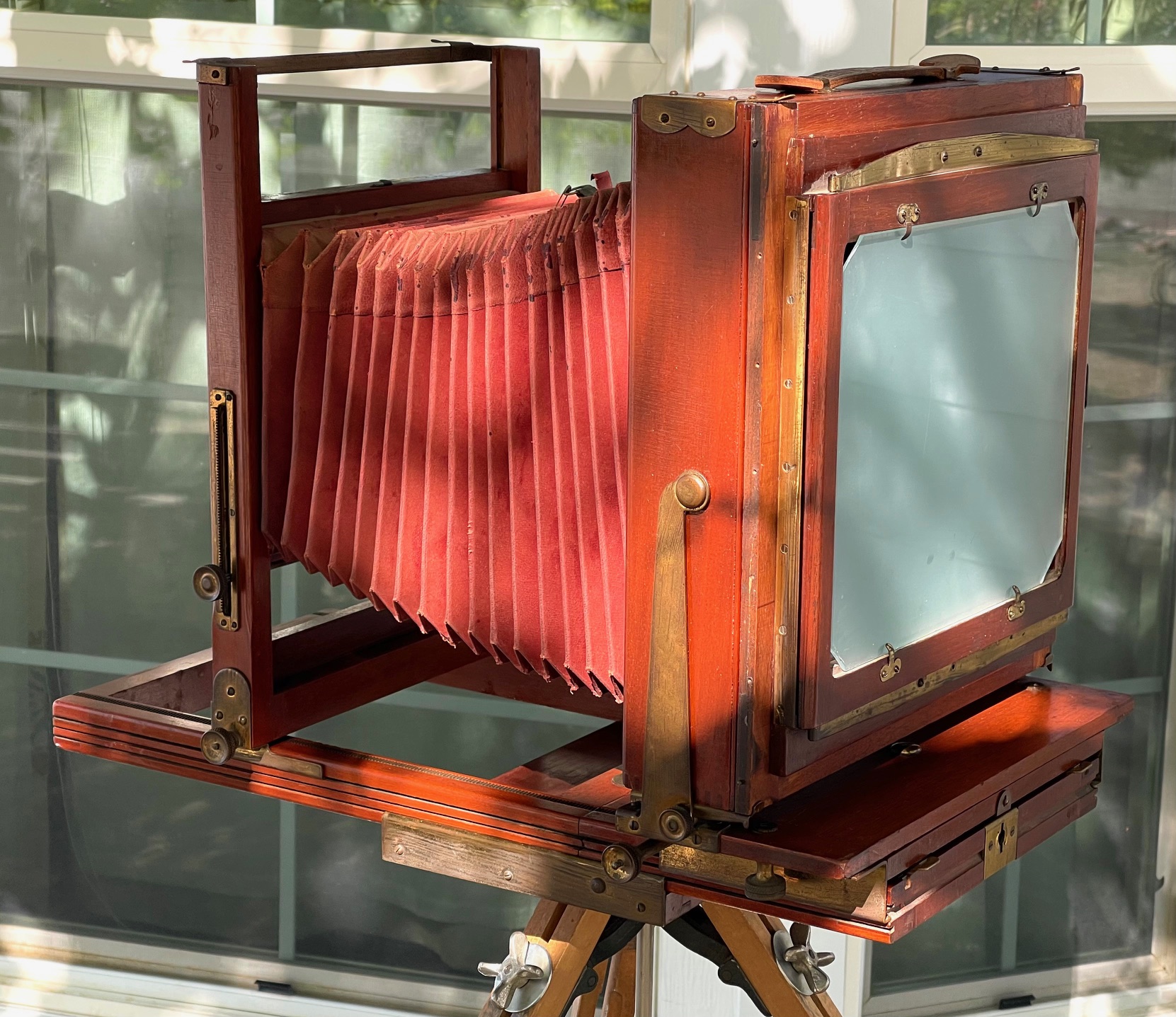 Here is most of an Eastman Improved #2 7X11 camera. It does not have the 7X11 back. But it does have 5X7 capability but it requires 2 screws to remove the 8X10 from the adapter and install the 5X7 with the 2 screws. A little different. Takes about 30 seconds. So if the moonrise is lighting the crosses, you better not try to switch it in time. 210 G Claron covers 8X10. Bellows are tired but I could use them with a dark cloth wrap. I wouldn't buy new ones, but everyone's threshold is different. $525 + shipping / offers